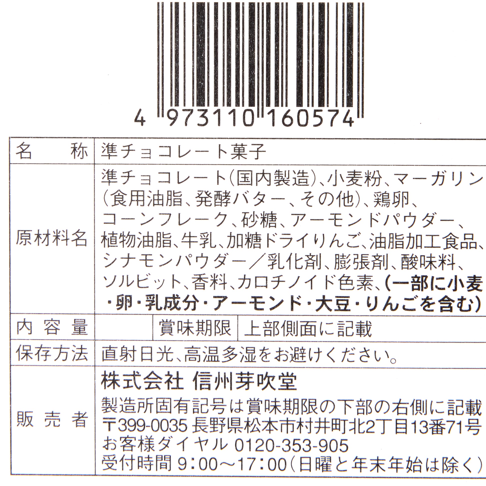Delight in the comforting harmony of flavors and textures in this elegant sandwich cookie. Made with Shinshu apples from Nagano—renowned for their crisp sweetness and refreshing aroma—the creamy apple filling is gently infused between two cinnamon-scented biscuits. A thin layer of cornflakes adds a delicate crunch, enhancing each bite with a playful contrast of smooth and crisp. Balancing warmth, sweetness, and texture, this confection captures the essence of Nagano’s celebrated apples in every refined mouthful.