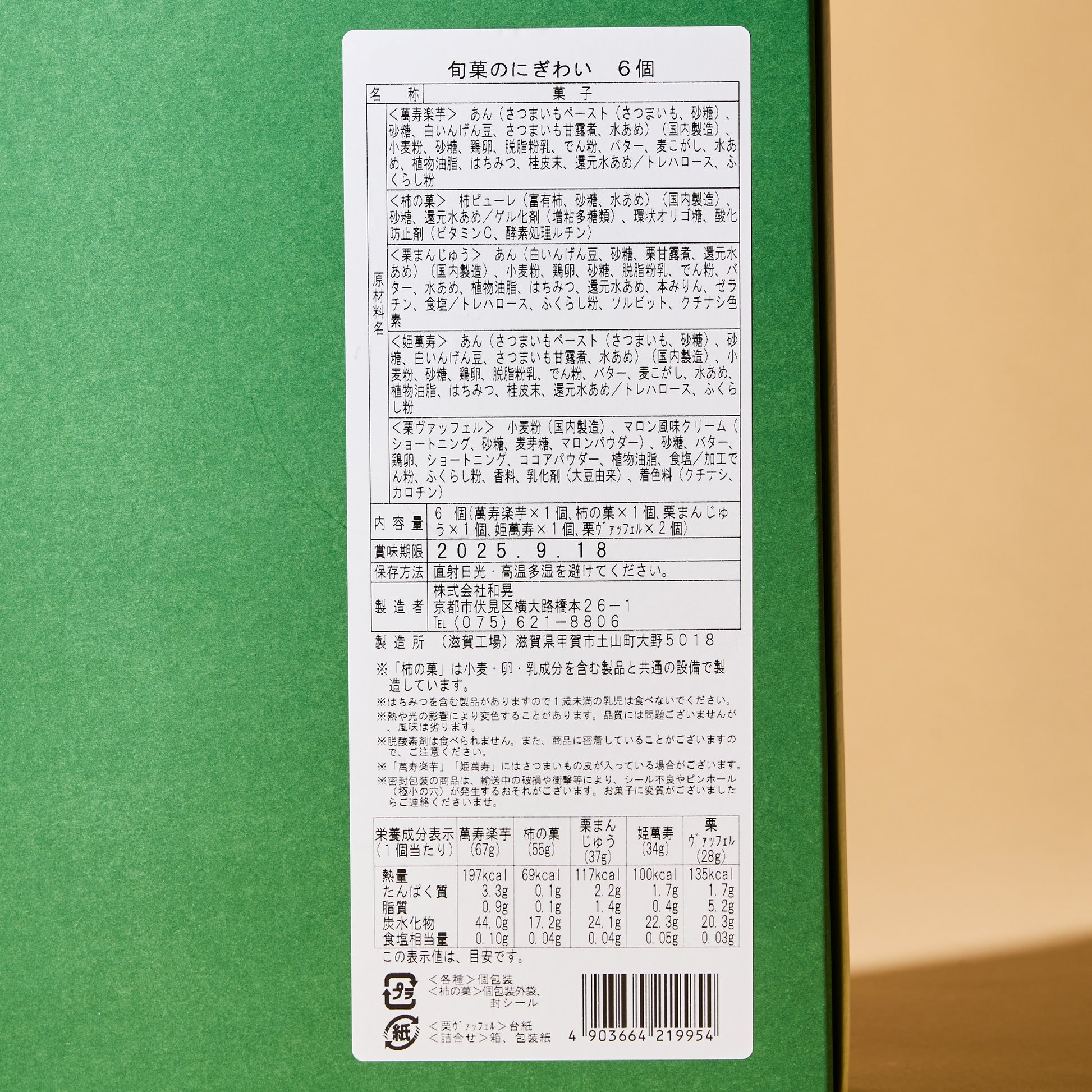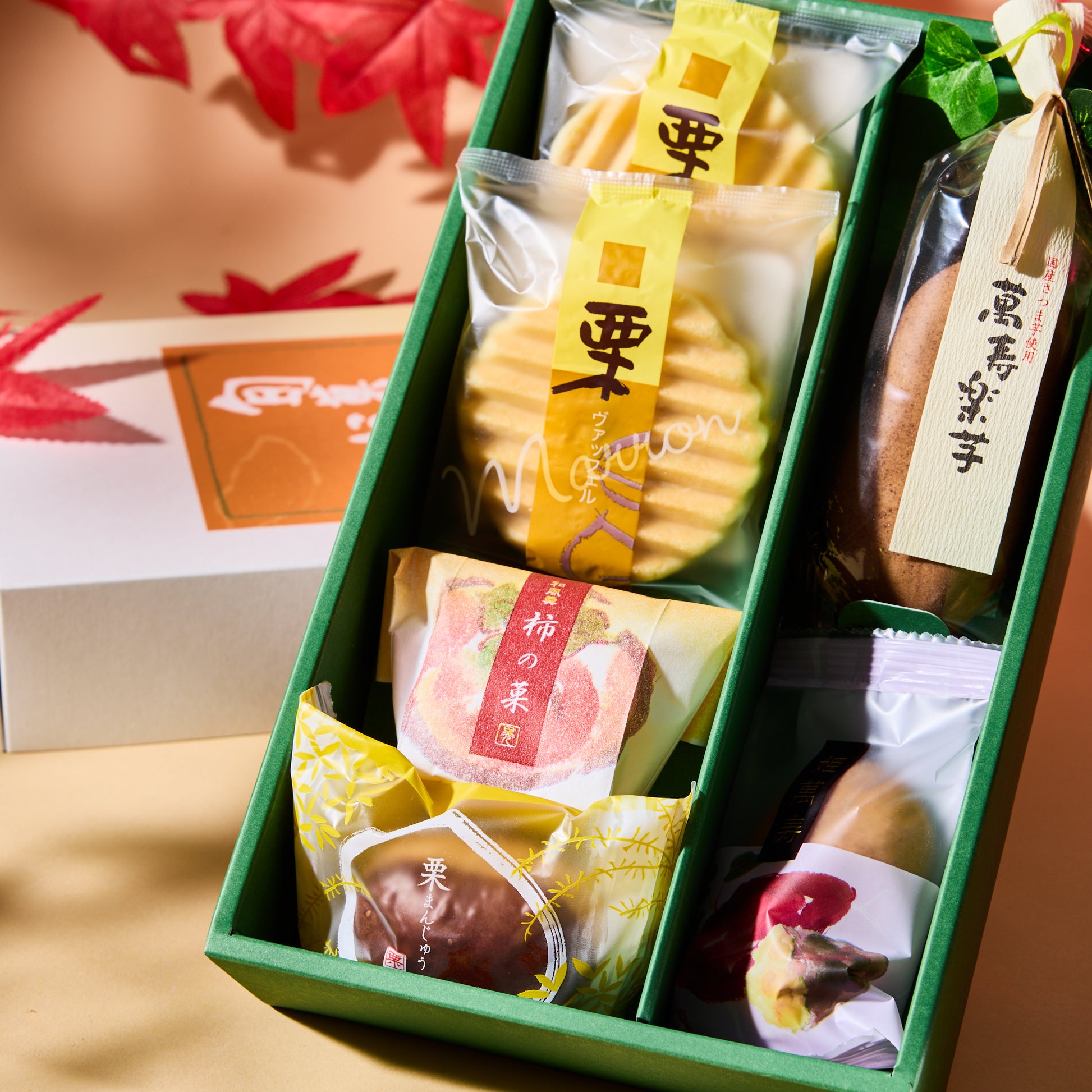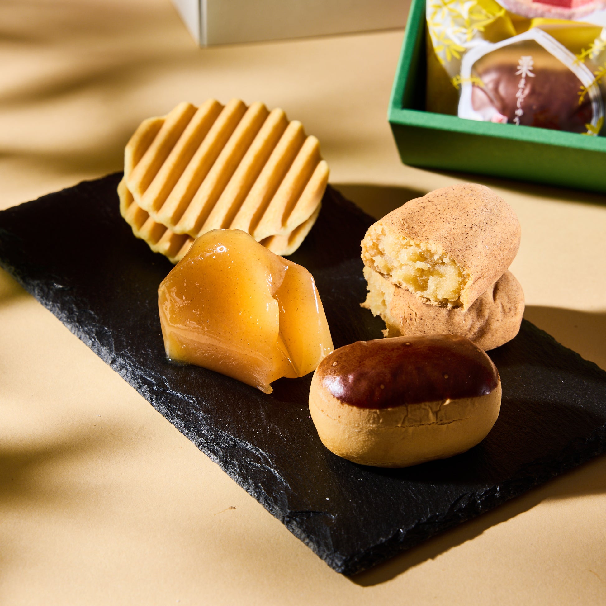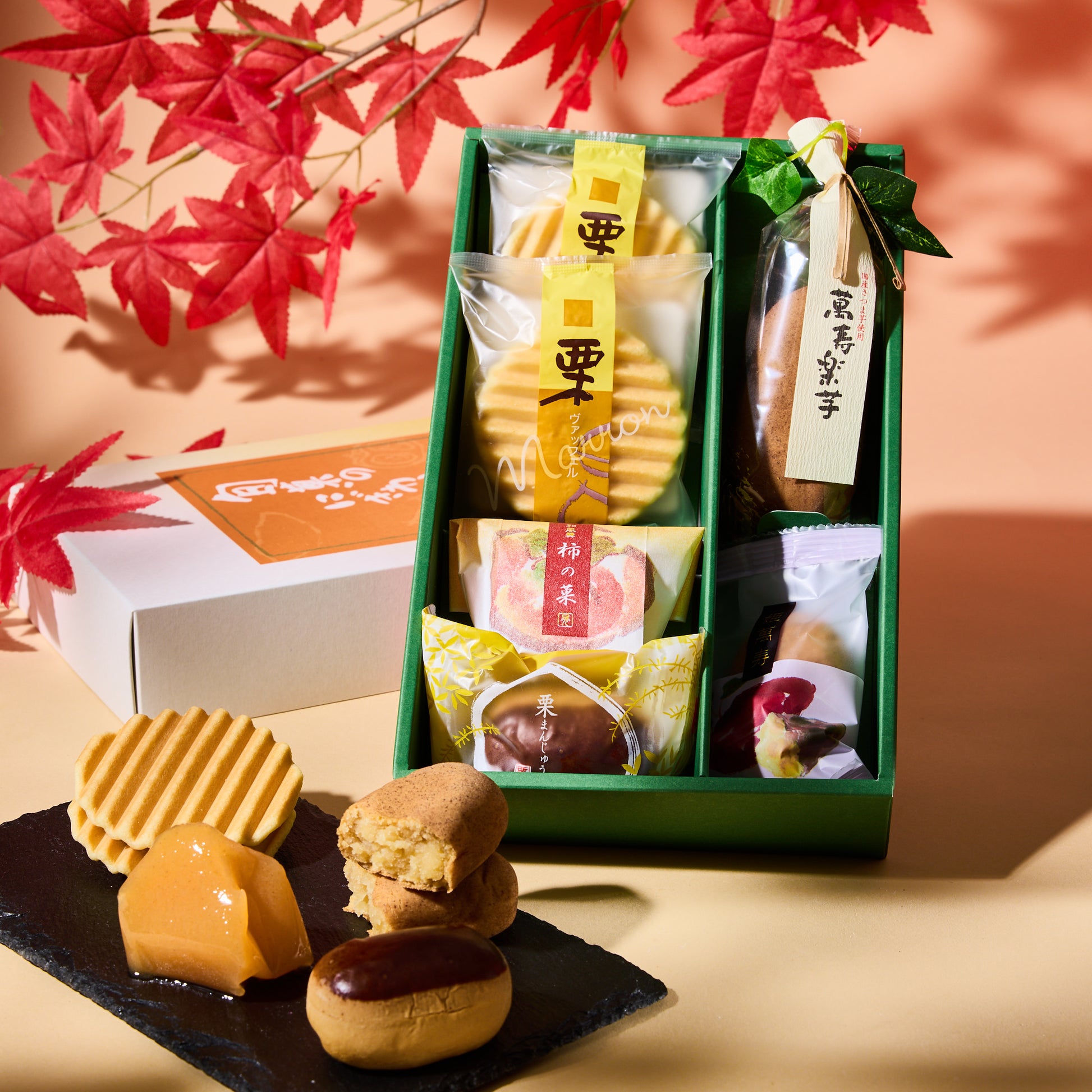 This assortment includes a crisp waffle cream cookie sandwiching rich chestnut-infused cream, and two types of manju—one with smooth chestnut-infused white bean paste, and another featuring sweet potato with smooth bean paste in a soft, moist dough. Also included is a manjuraku imo wagashi, filled with domestic sweet potato paste, and a tender persimmon confection with a jelly-like texture and gentle sweetness. Savor a refined, thoughtfully crafted taste of autumn.