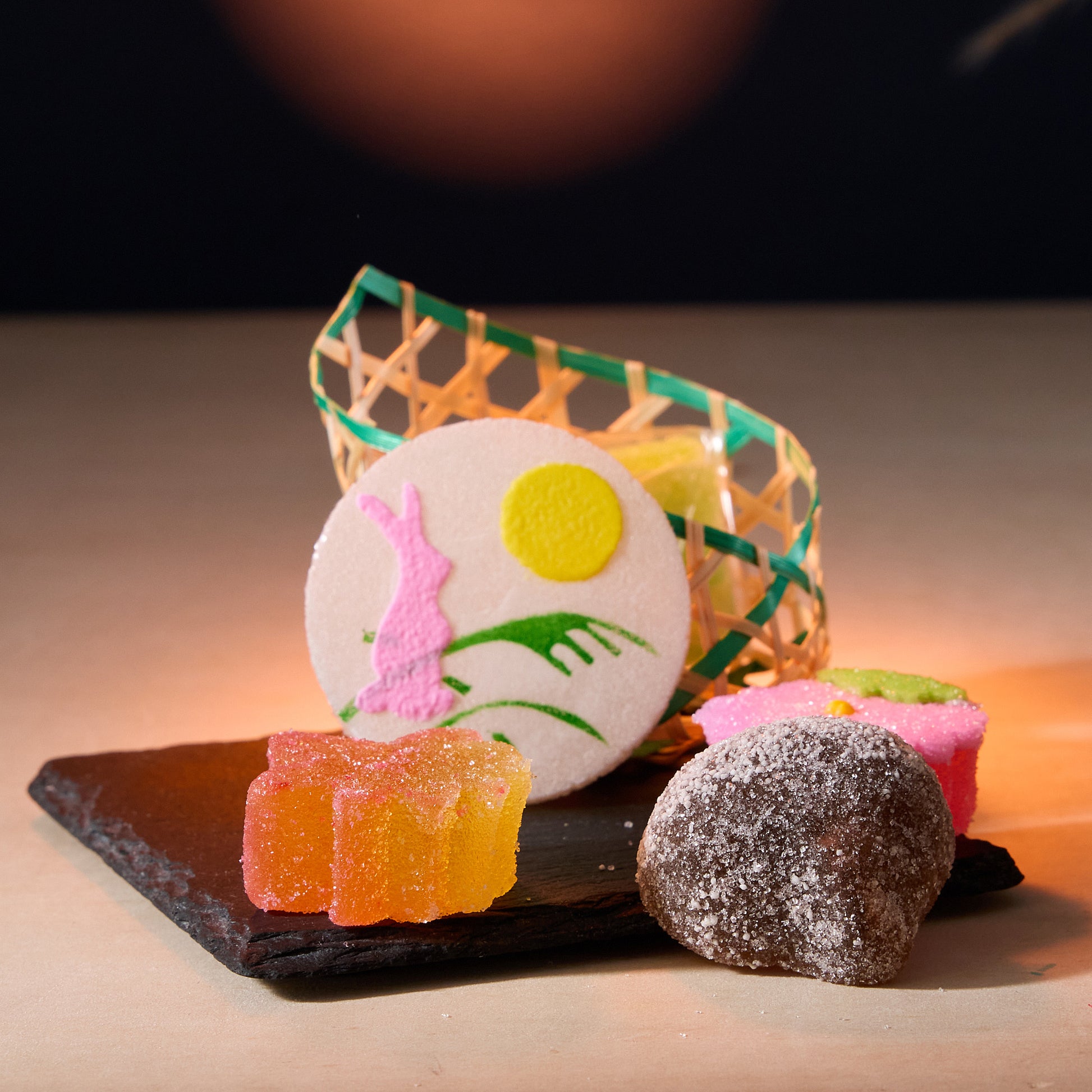 Welcome the season with these delicate kanten (agar) jelly treats, inspired by tsukimi, Japan’s autumn moon-viewing tradition. Each piece is shaped with seasonal motifs—a momiji (Japanese maple) leaf, a chestnut, and an outlined usagi (rabbit), symbols long associated with tsukimi. Chewy and subtly sweet, these confections offer a refined, seasonal treat for any time of day.