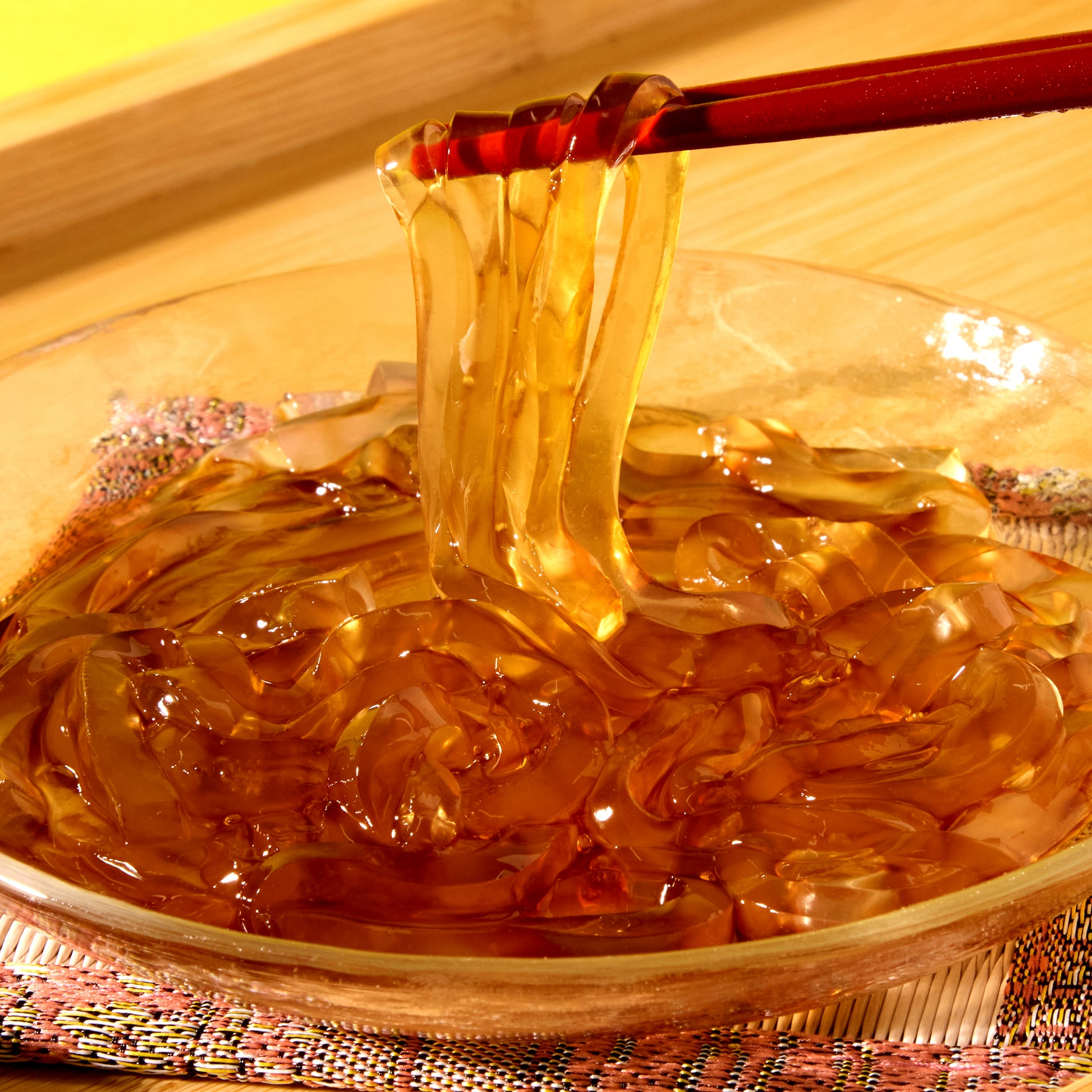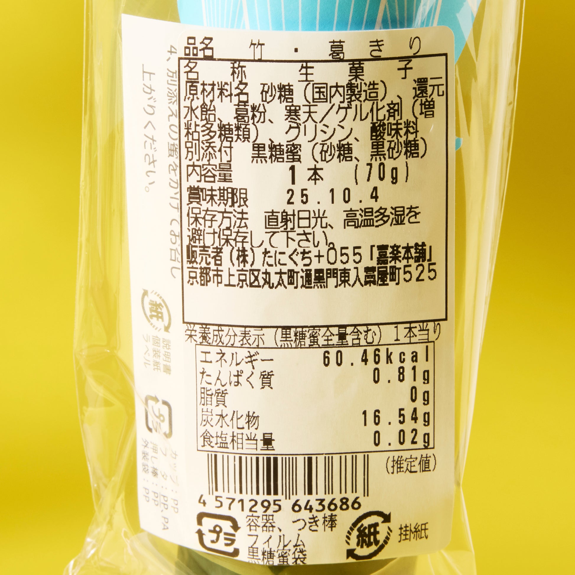 Served in a bamboo tube, the smooth, translucent kuzukiri, a traditional Japanese confection made from kudzu starch and known for its slippery texture and delicate flavor, offers a delicate, cooling sensation with each bite.