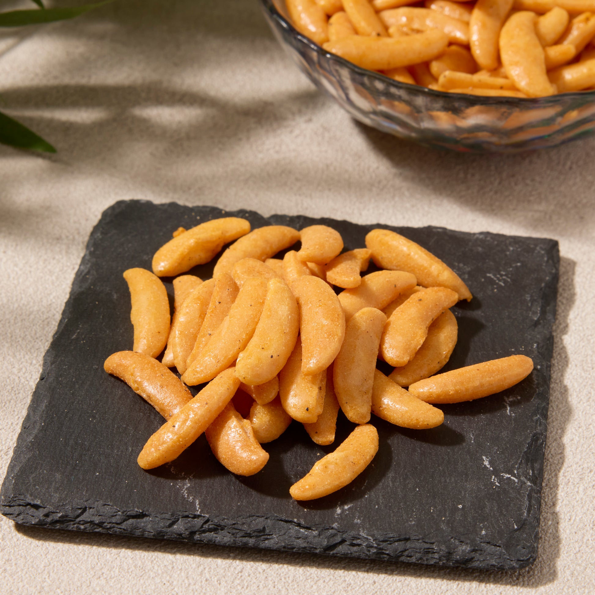 A bold and savory twist on a classic Japanese snack, these crescent-shaped kakinotane rice crackers are seasoned with a rich cheese blend and finished with the sharp heat of black pepper.