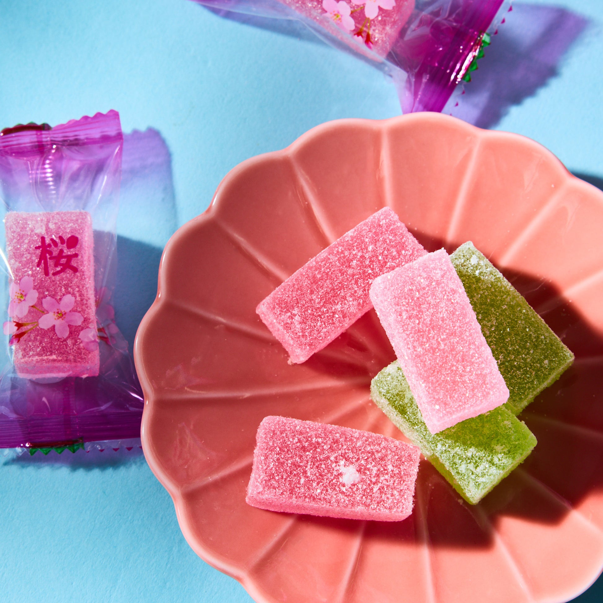 This two-hued kanten jelly in soft pink cherry and pale peach evokes the gentle bloom of sakura and the freshness of spring air. Light, subtly sweet, and elegantly soft, each bite brings a delicate moment of seasonal joy.