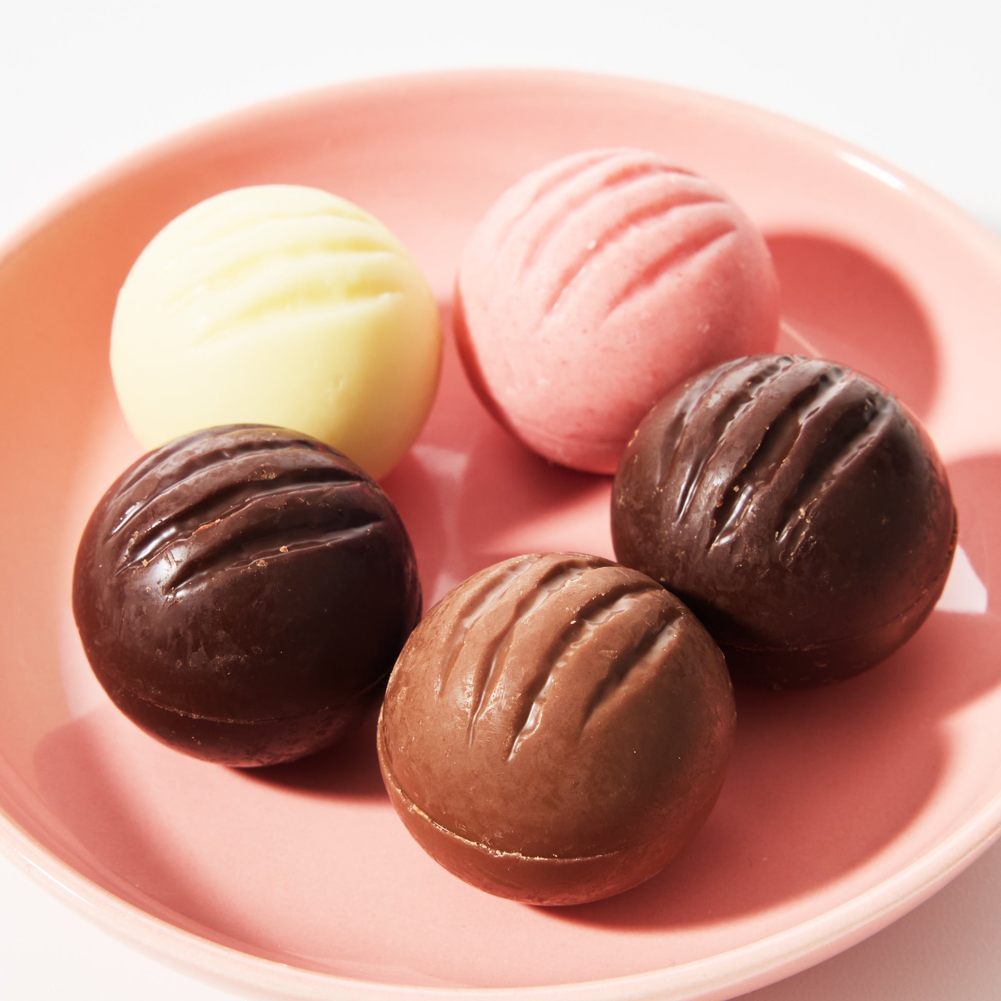 This assortment includes five Hokkaido-made chocolates in rich dark, creamy milk, smooth white, fruity strawberry, and tangy dark raspberry chocolate flavors.