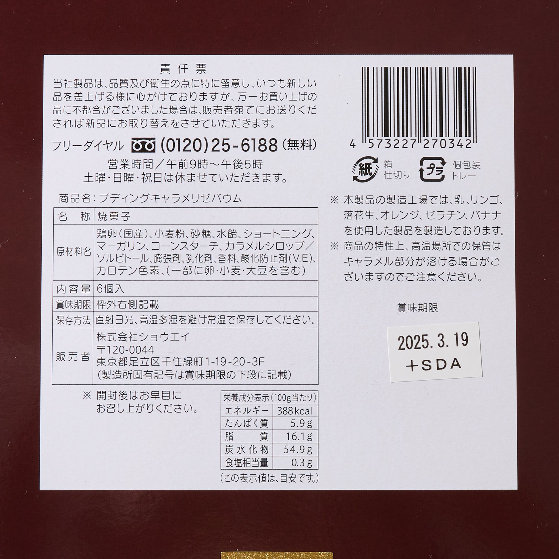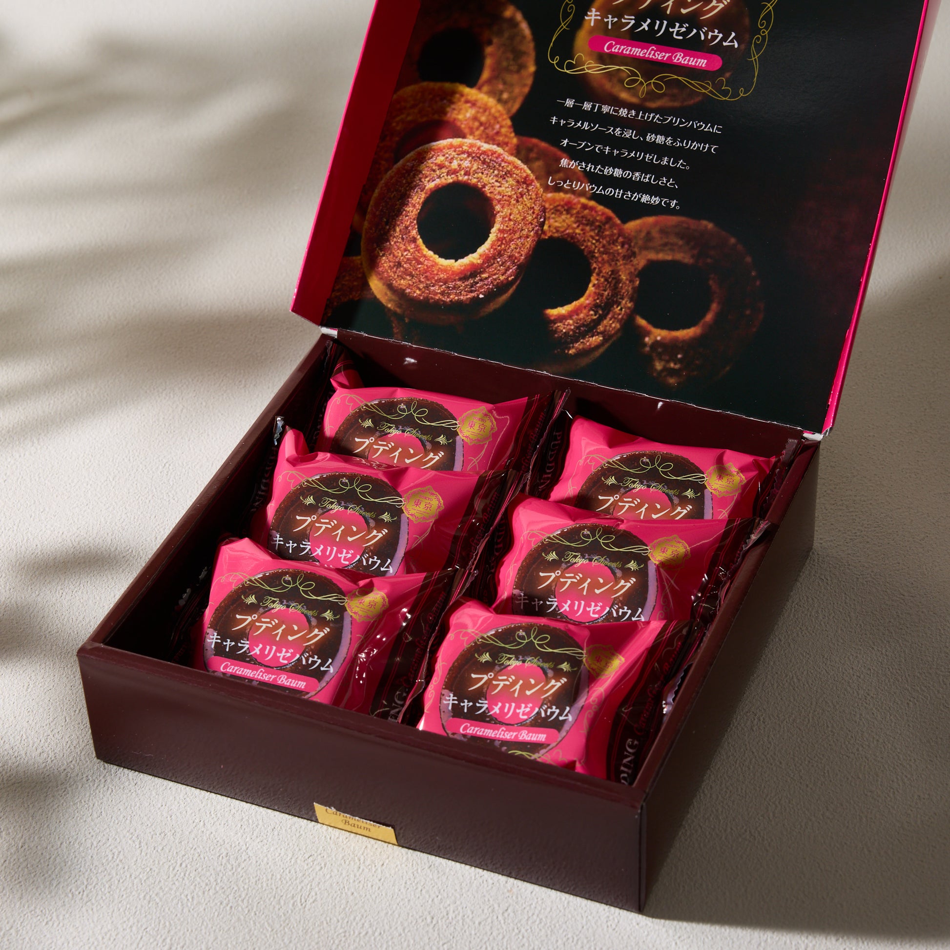 This Japanese baumkuchen is meticulously crafted by layering pudding-flavored batter, baking each layer until golden, and then dipping it in rich caramel sauce. It is then lightly sprinkled with sugar and caramelized to perfection, creating a beautiful golden finish.