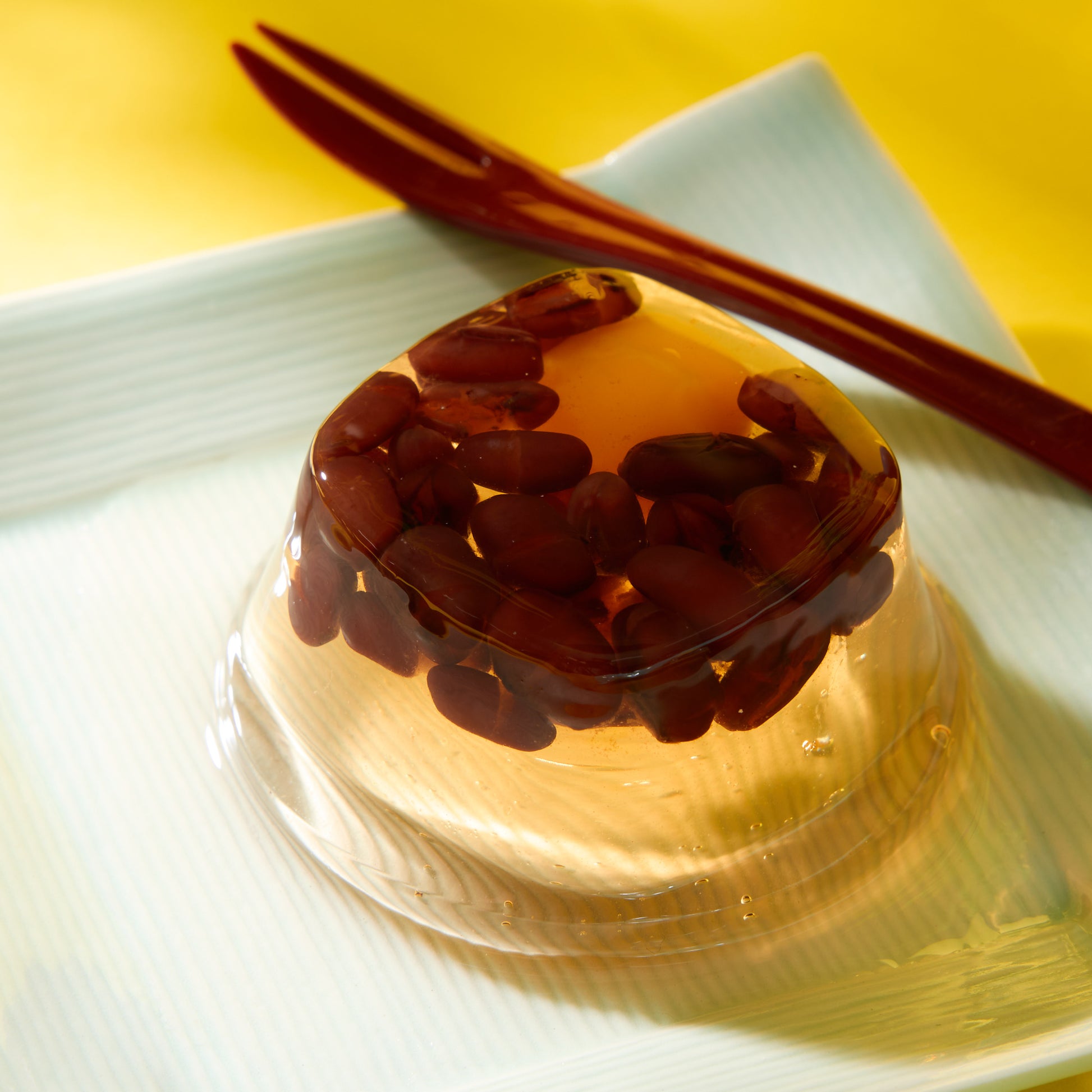 This traditional jelly confection features a gently chewy texture with whole candied chestnuts and sweetened adzuki beans suspended inside, creating a subtle and well-balanced flavor.
