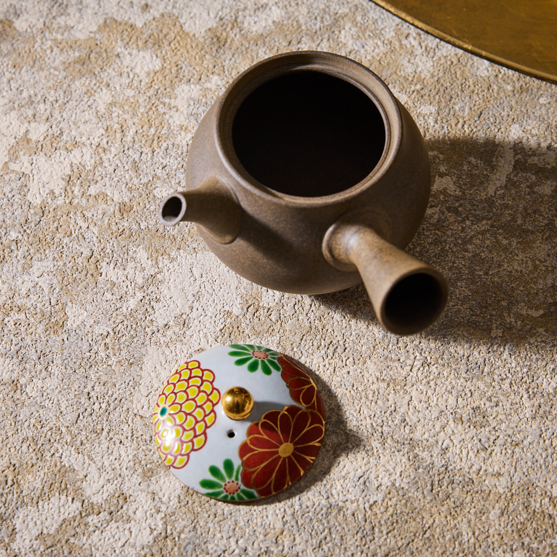 Handcrafted by expert craftsman Tsuzuki Yutaka of Daikoji Kiln, this teapot features a thoughtfully designed handle for ease in pouring. The lid is adorned with a vibrant chrysanthemum floral motif in celebratory shades like yellow and orange, highlighted with a subtle gold accent for a refined touch.
