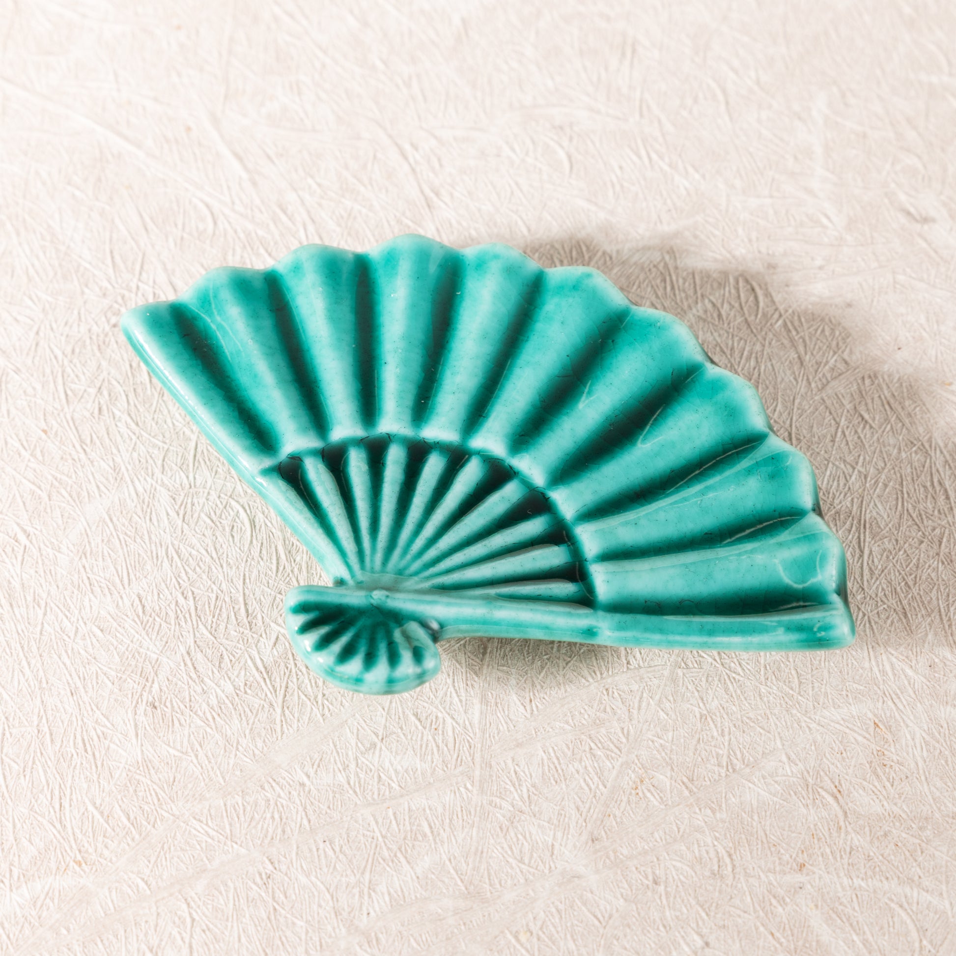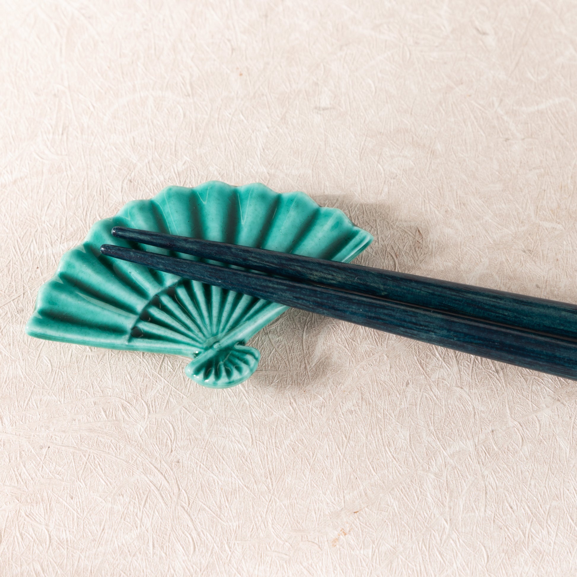 Shaped like a traditional Japanese folding fan, this ceramic chopstick rest features gentle green hues and a detailed outline. Crafted by Bloom, a maker based in Gifu Prefecture known for their Mino ware ceramics, this intricate piece draws from classic Japanese symbols, adding a quiet sense of tradition to the table.