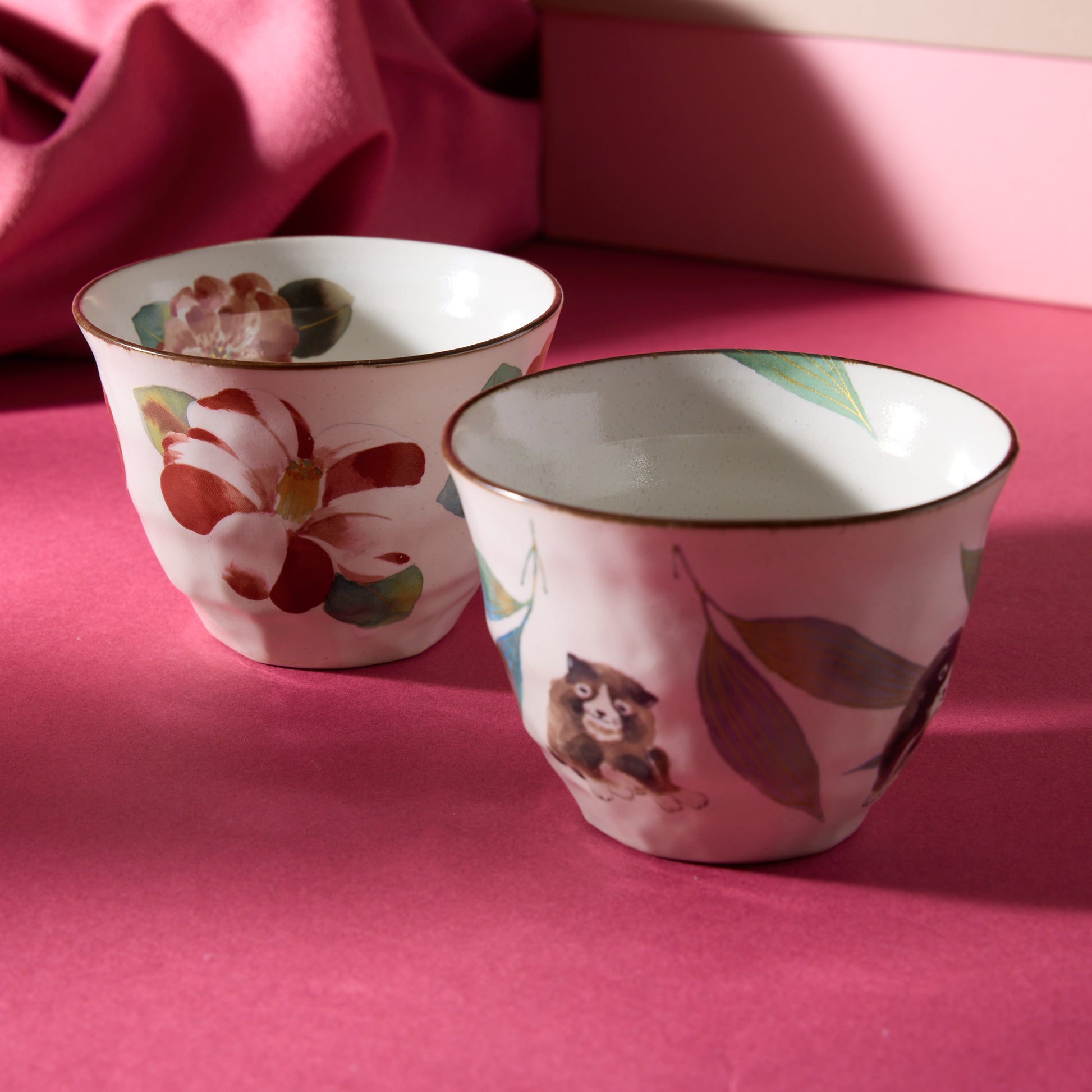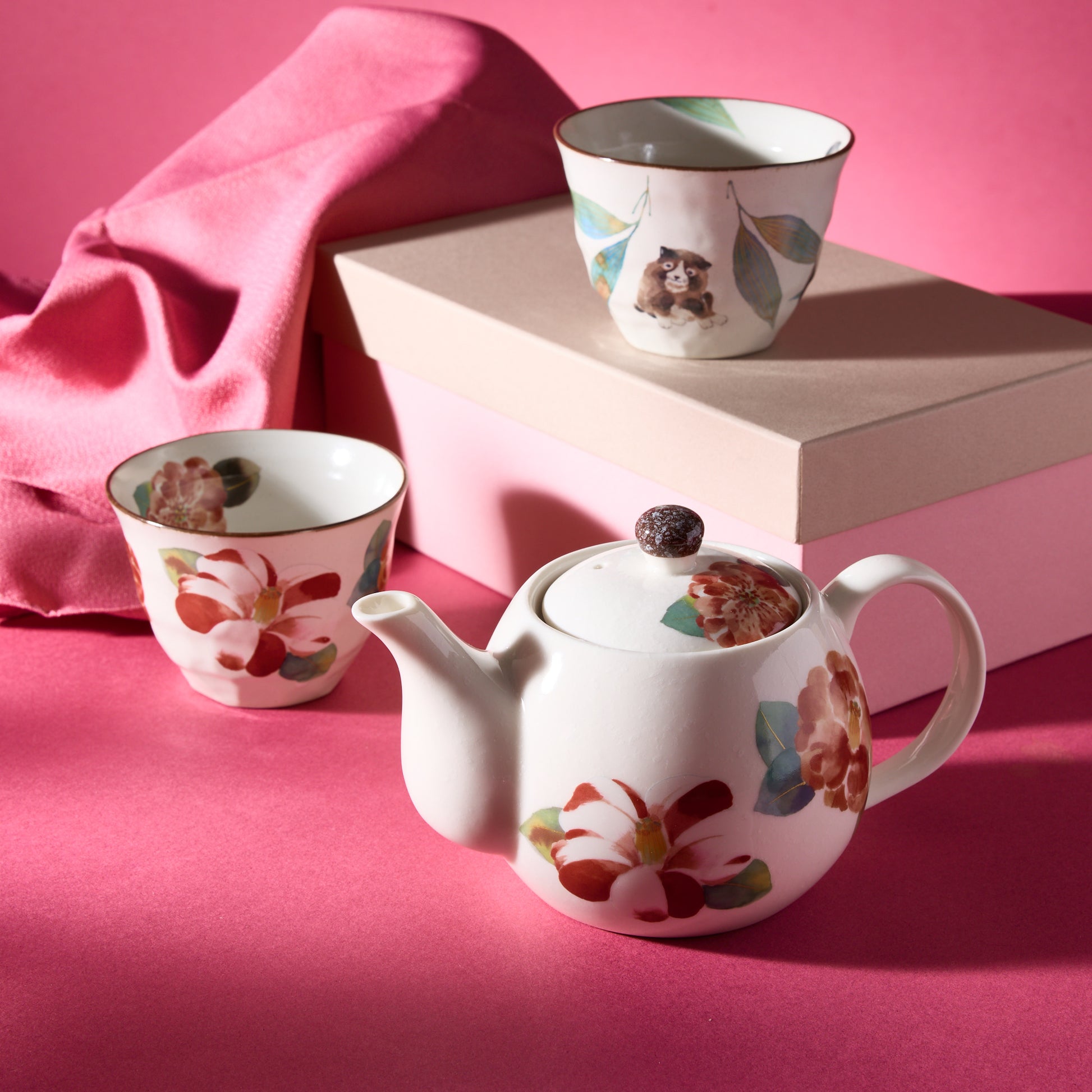 The set includes two teacups and showcase intricate designs featuring vibrant flowers, plants, and lively dogs, reflecting the beauty of nature throughout the year.