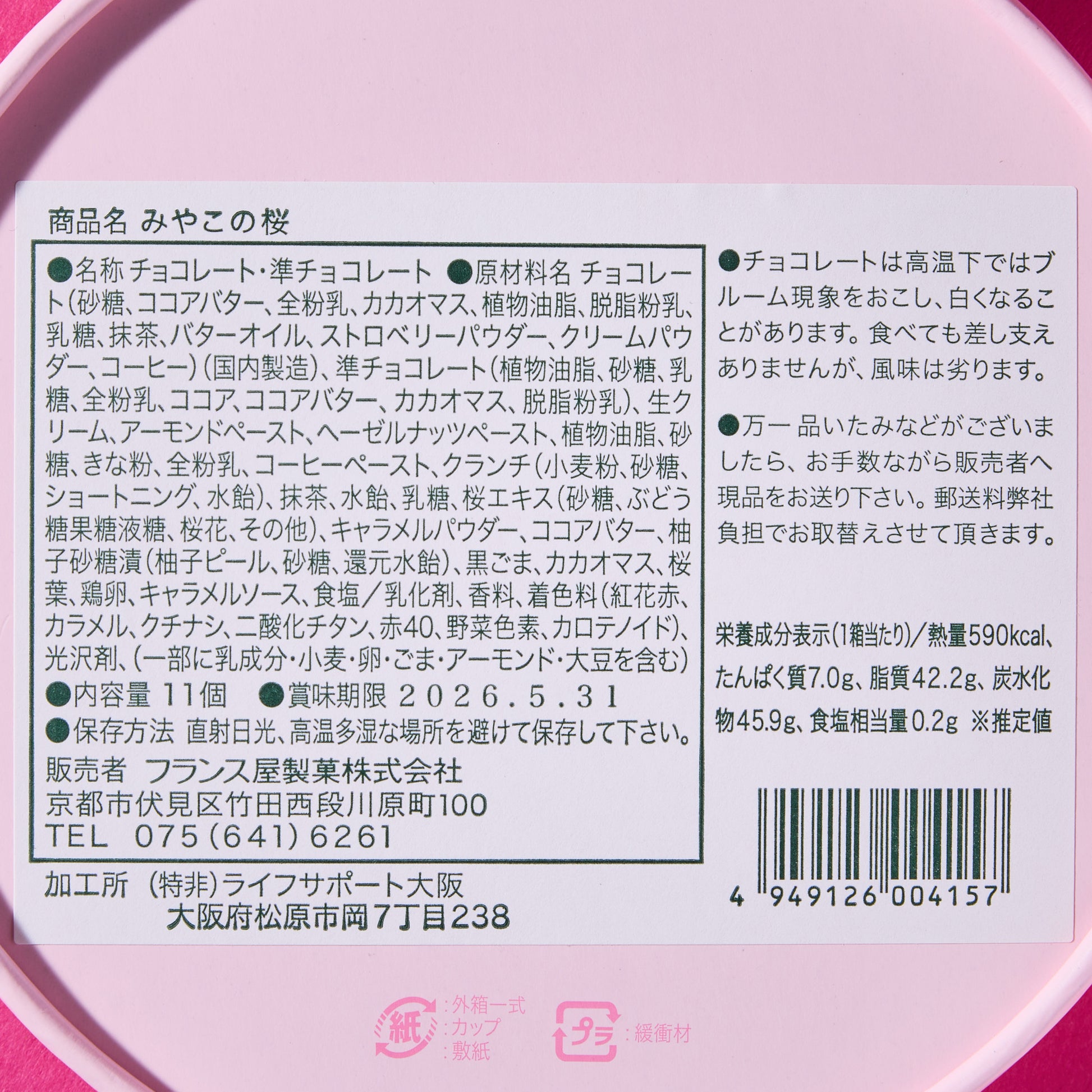 • Soft chocolate with a light sakura scent, coated in sweet strawberry-flavored chocolate