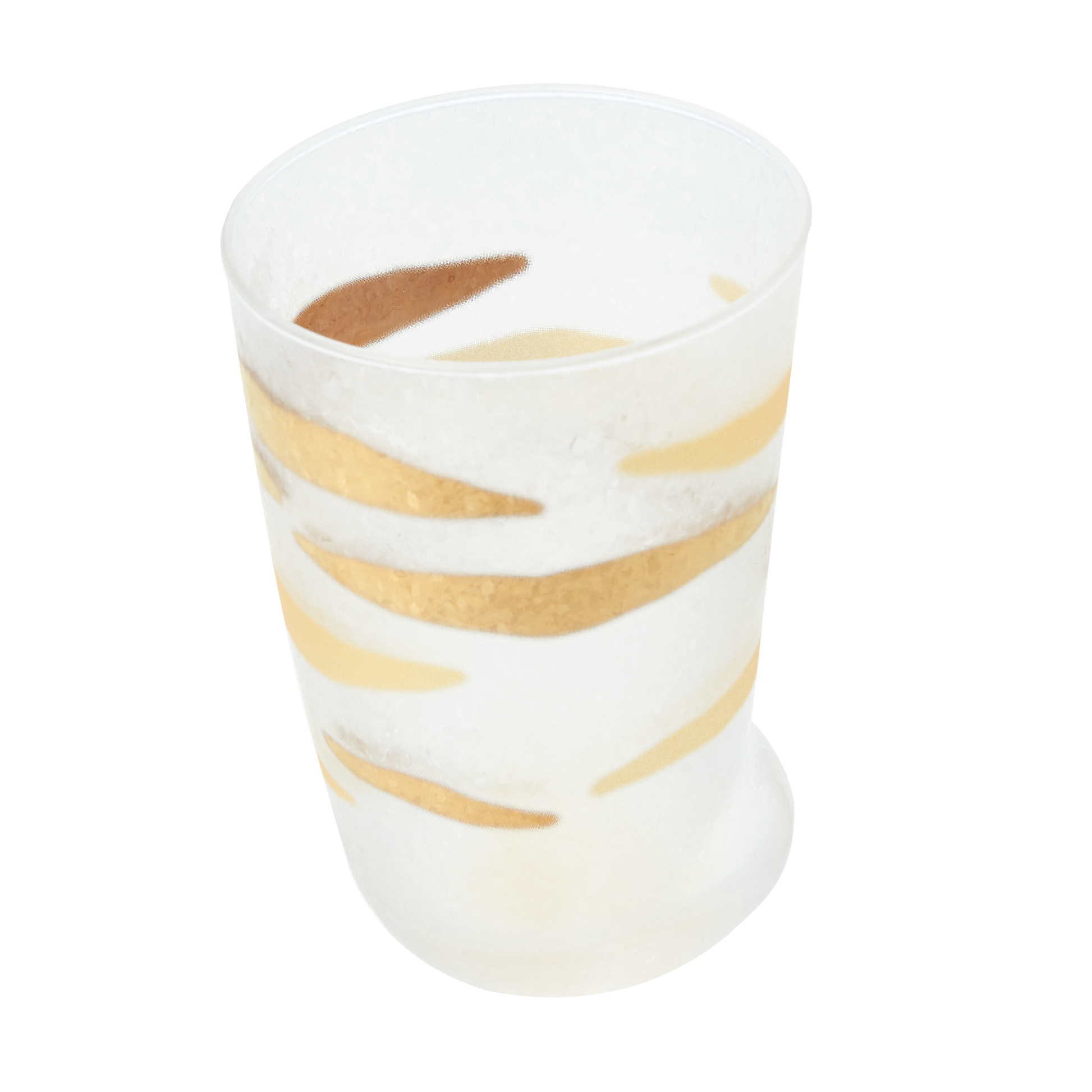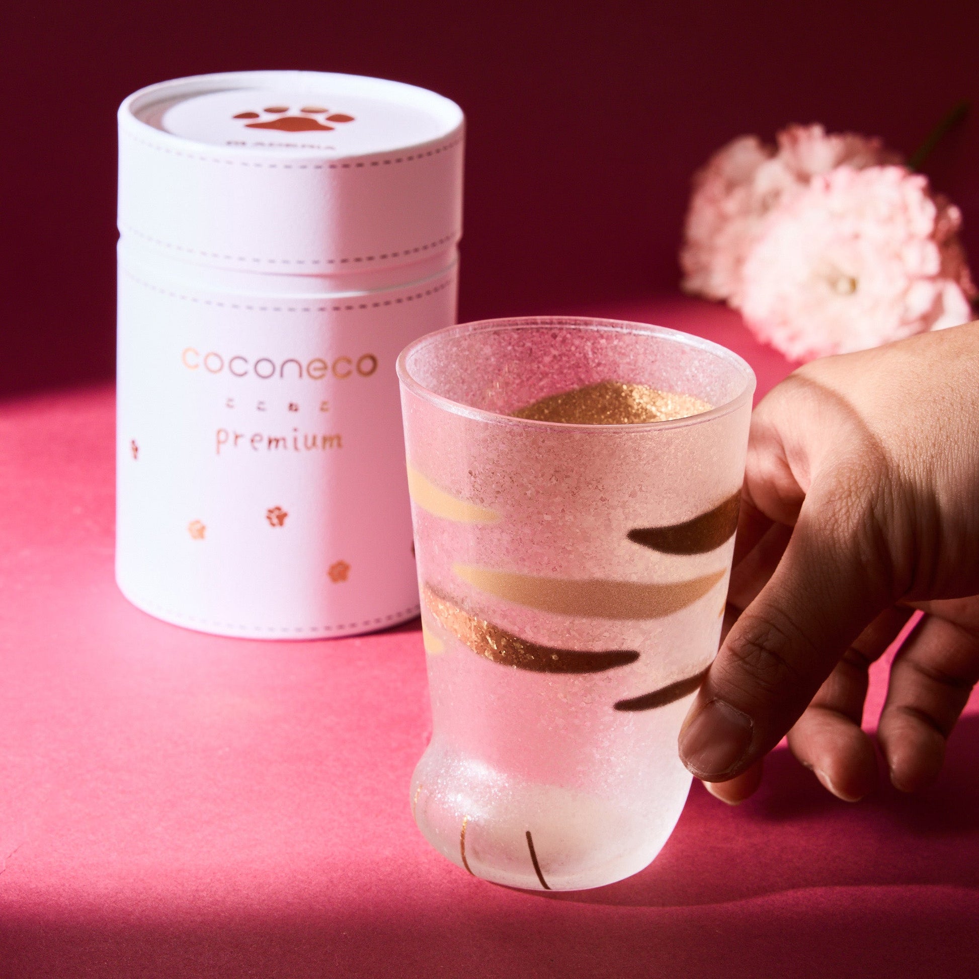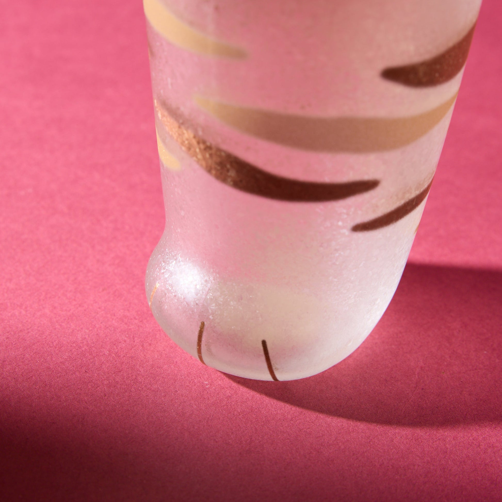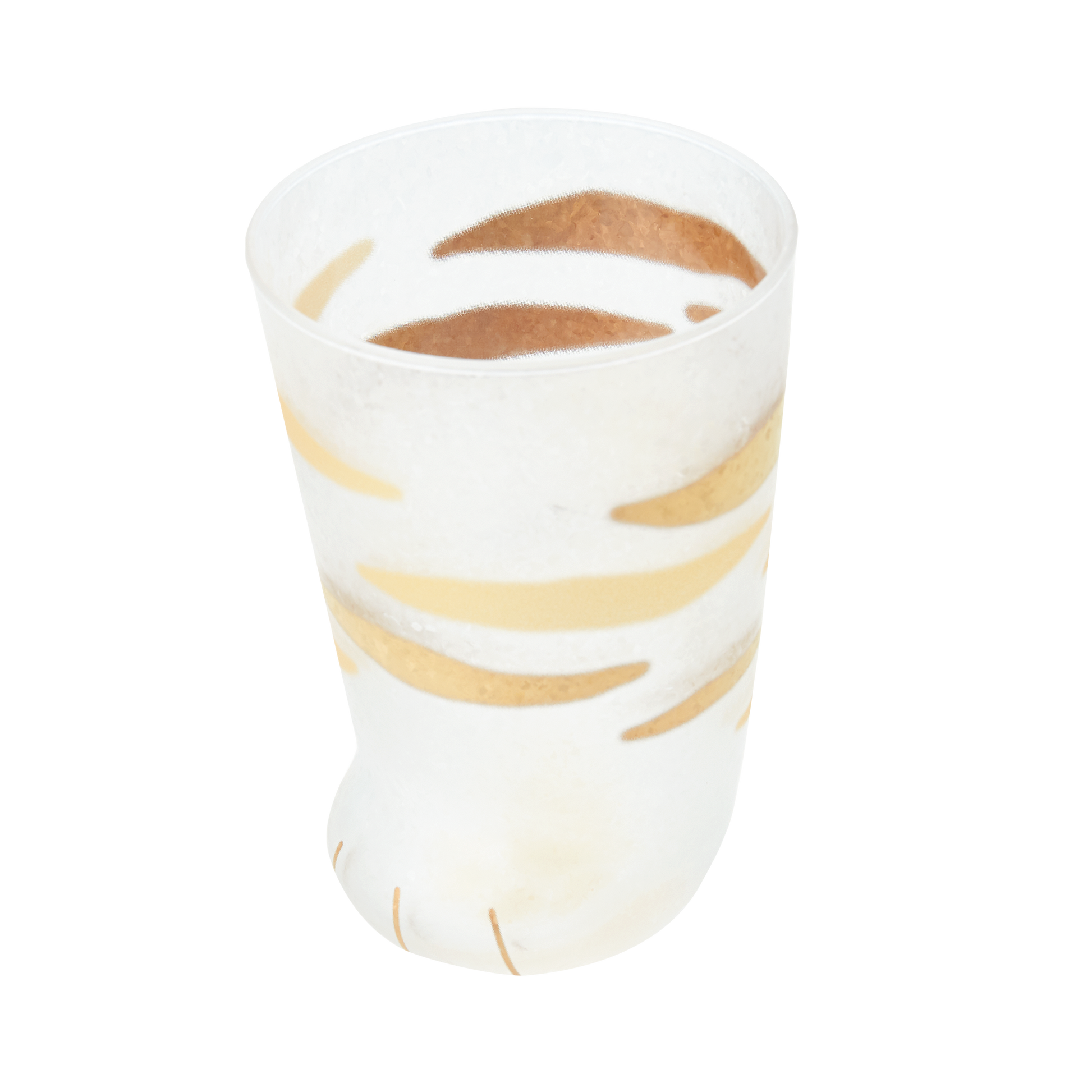 This glass is uniquely shaped like a cat's paw, crafted from frosted glass and adorned with intricate gold leaf patterns representing different cat personalities.