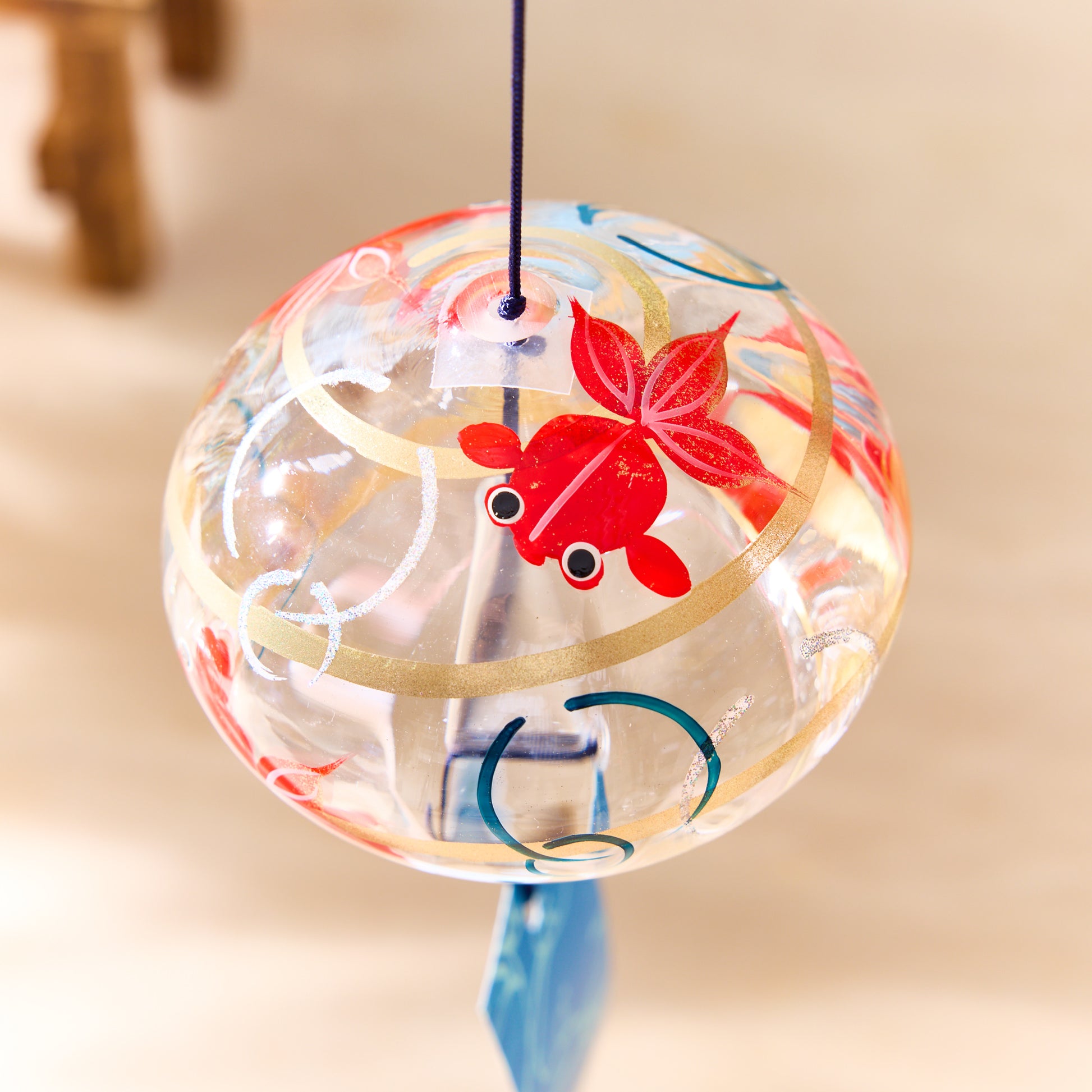 Adorned with hand-painted goldfish—creatures often associated with summer festivals and tranquil garden ponds in Japan—this wind chime brings both movement and melody to your space. The clear glass body allows sunlight to dance through, while the soft sound of the bell evokes the nostalgic calm of a breezy summer afternoon.