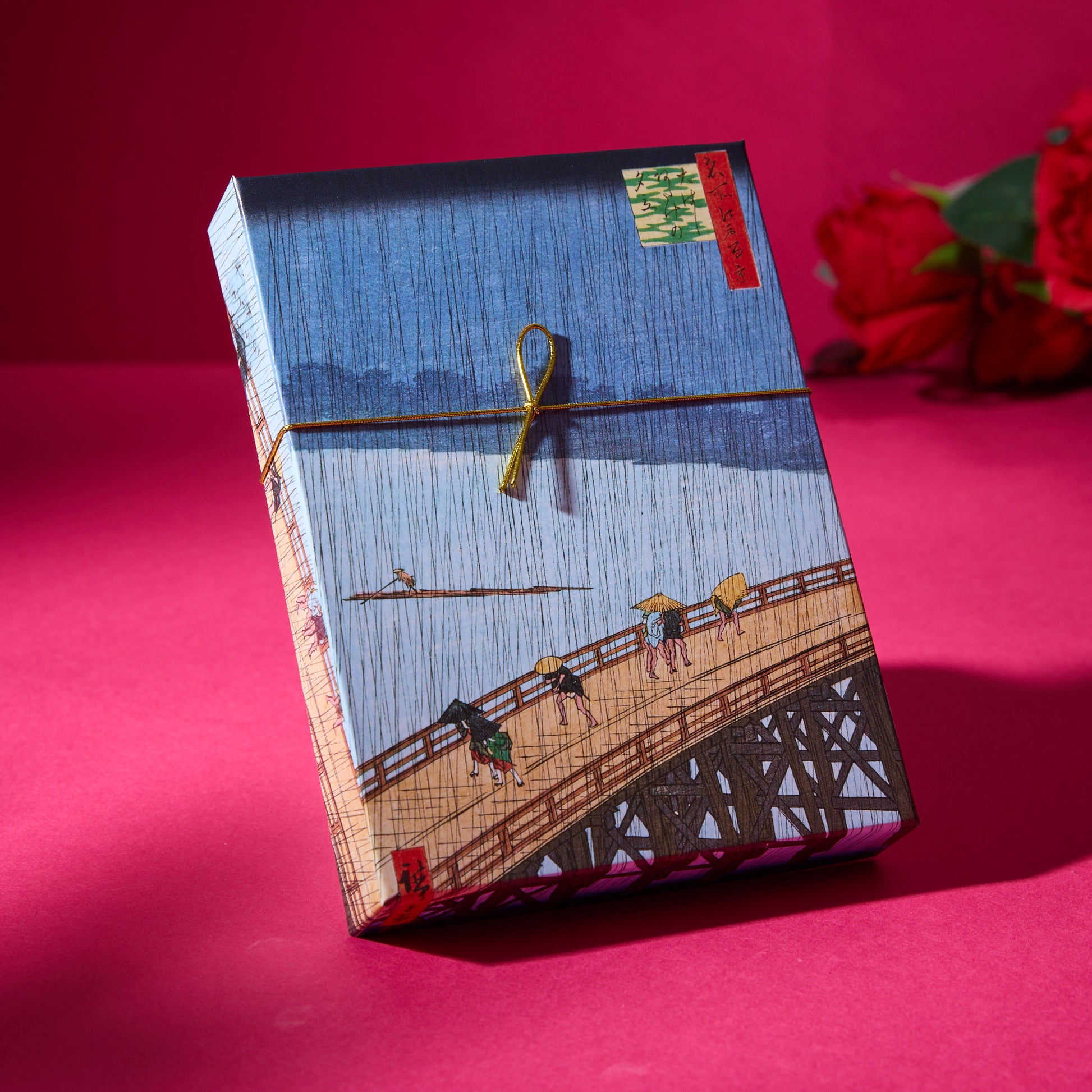 The package design draws inspiration from Sudden Shower over Shin-Ohashi Bridge and Atake, a work by the world-renowned ukiyo-e artist Utagawa Hiroshige.