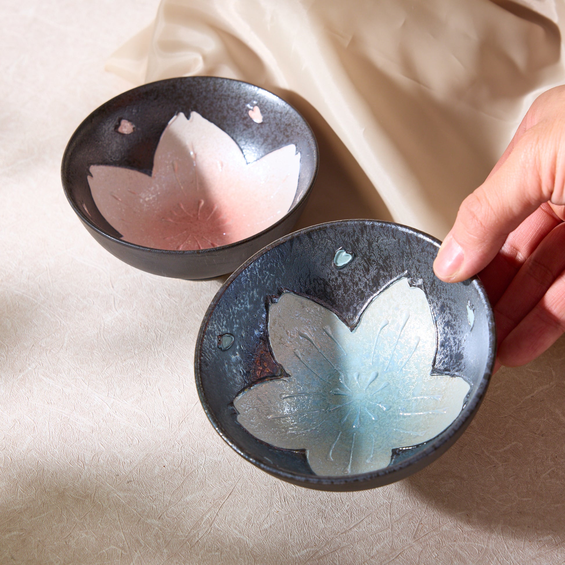 Crafted in the traditional Hasami Ware style from Nagasaki, this bowl pair features a large sakura design with scattered cherry blossom petals.