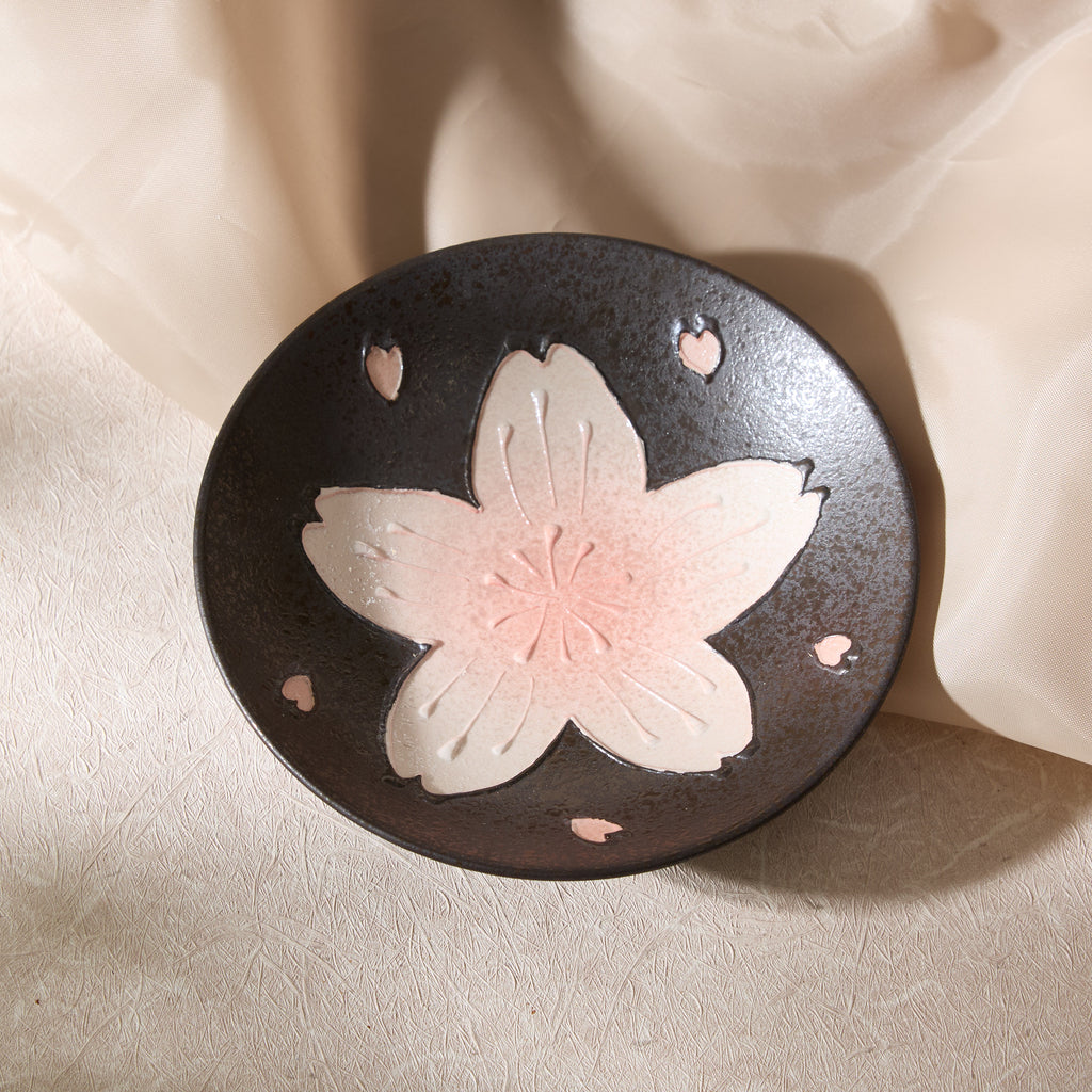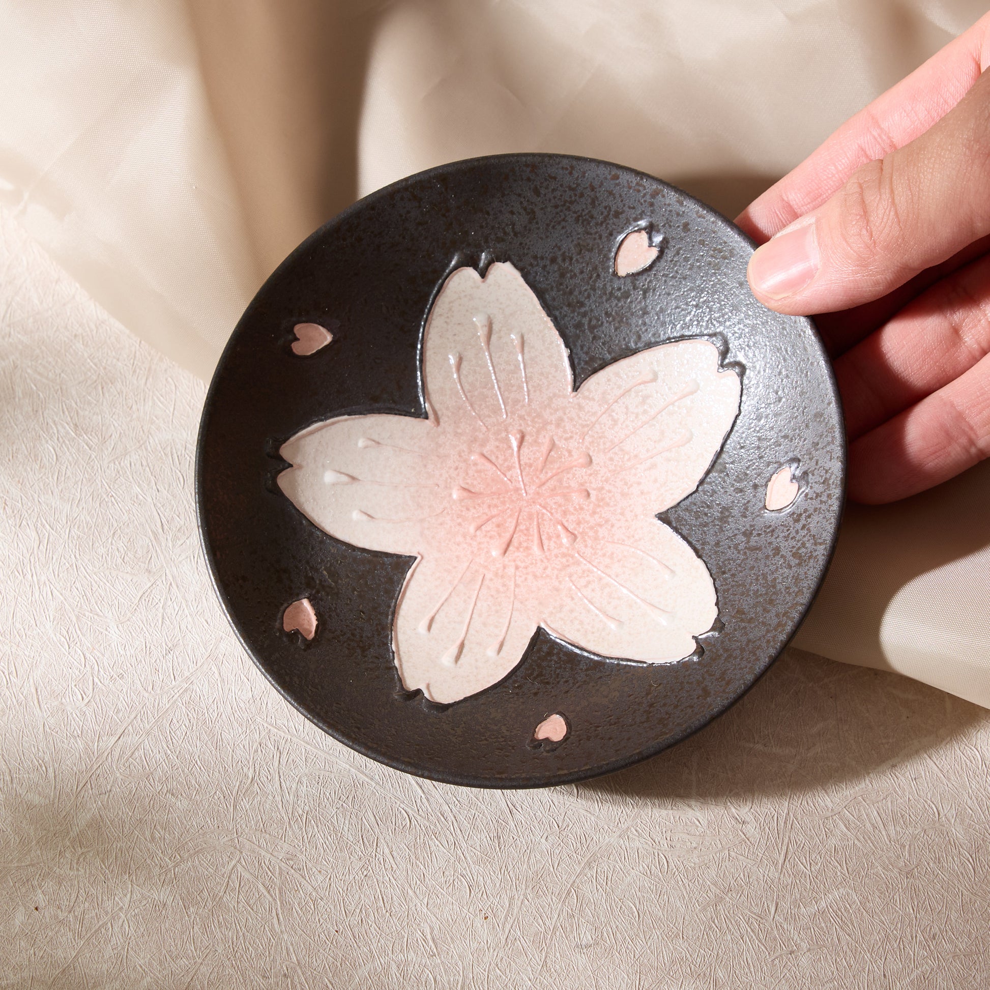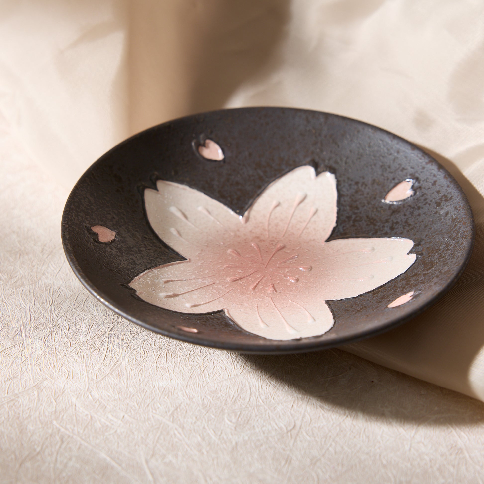 This beautiful plate, adorned with a graceful sakura design and scattered petals, is crafted in the Hasami Ware style from Nagasaki Prefecture, featuring a black glaze base with a gentle pink finish.