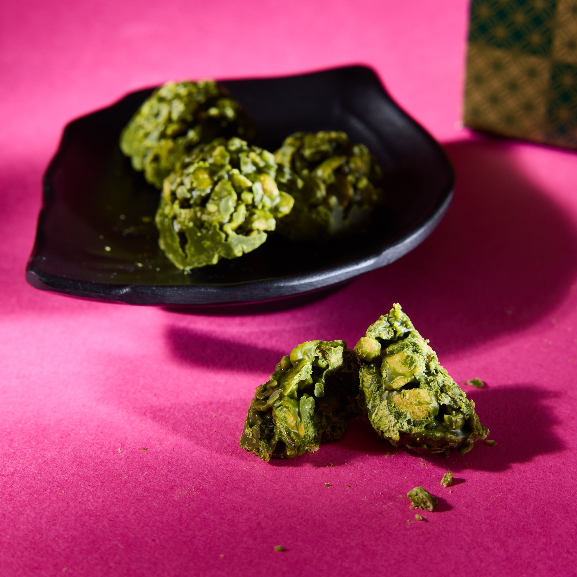 Enjoy a harmonious pairing of richly aromatic Kyoto Uji matcha chocolate and crisp arare rice crackers in this refined confection. The earthy notes of matcha are complemented by the sweetness of chocolate, offering a smooth, well-balanced taste.