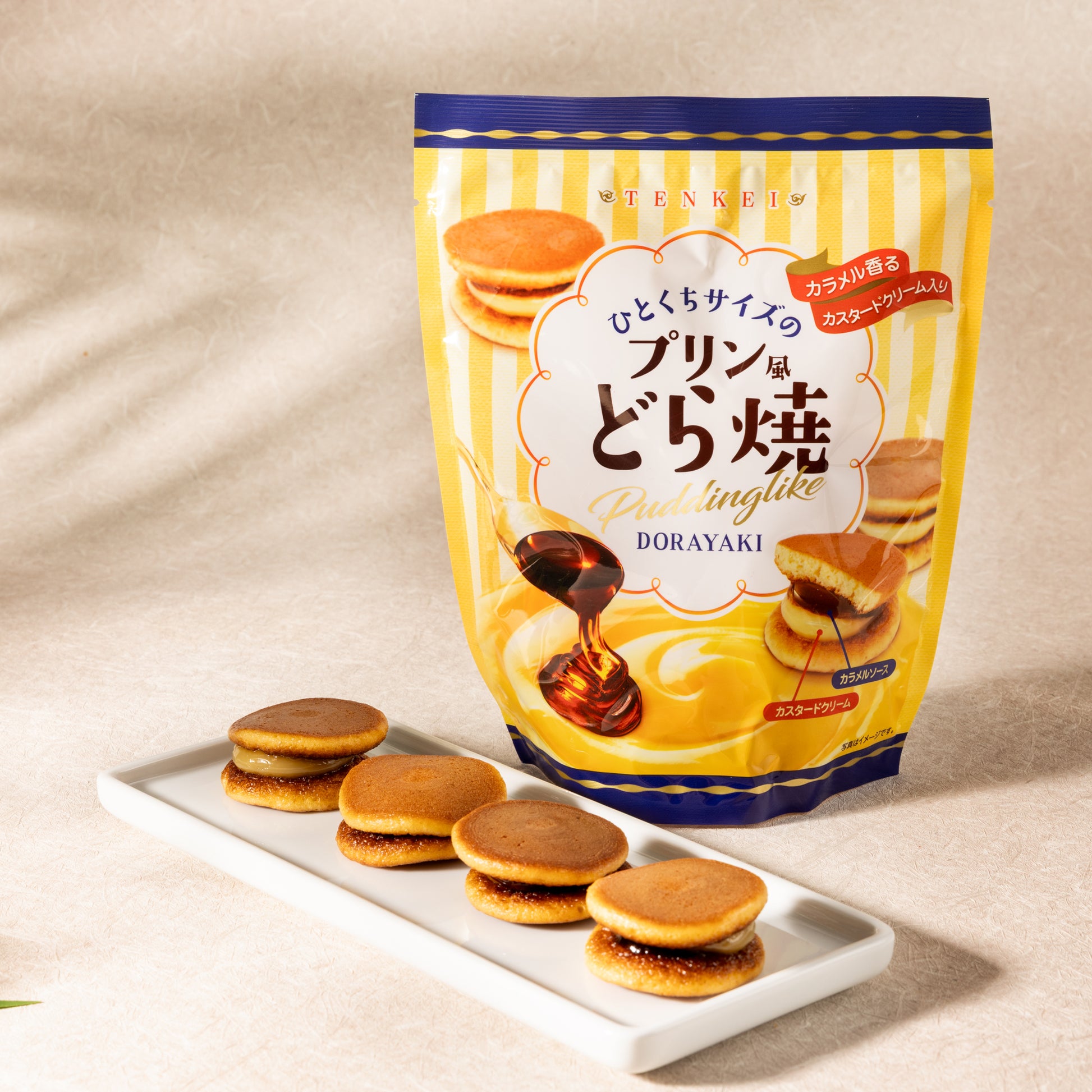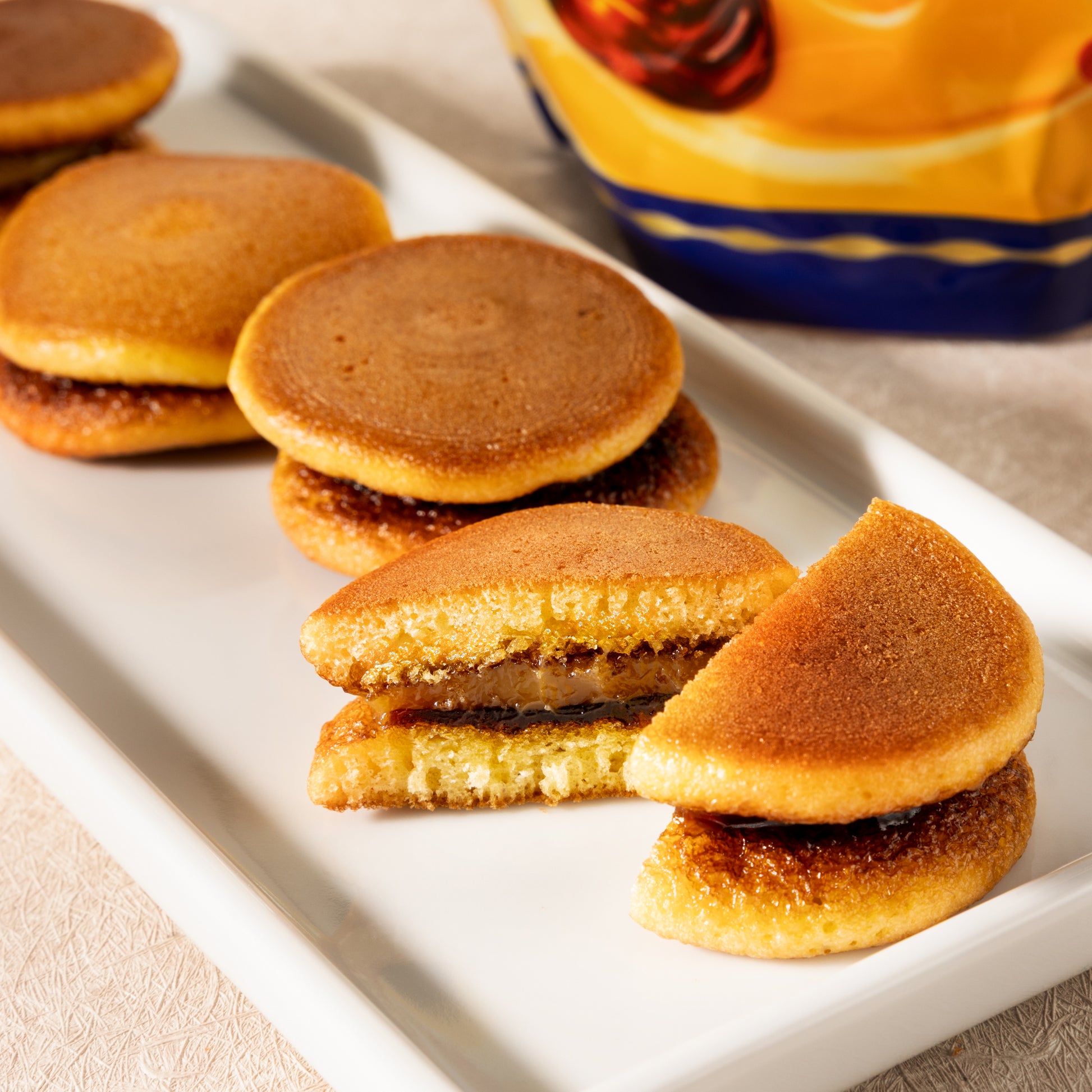This pudding-inspired dorayaki is a delightful twist on a classic Japanese confection, reimagined in a bite-sized form. Fluffy, golden pancakes are layered with silky custard cream and a touch of rich caramel sauce, evoking the familiar comfort of Japanese purin, or custard-style pudding. Soft in texture and gently sweet, each piece offers a satisfying indulgence in a petite, refined format—perfect for teatime or a small moment of sweetness.