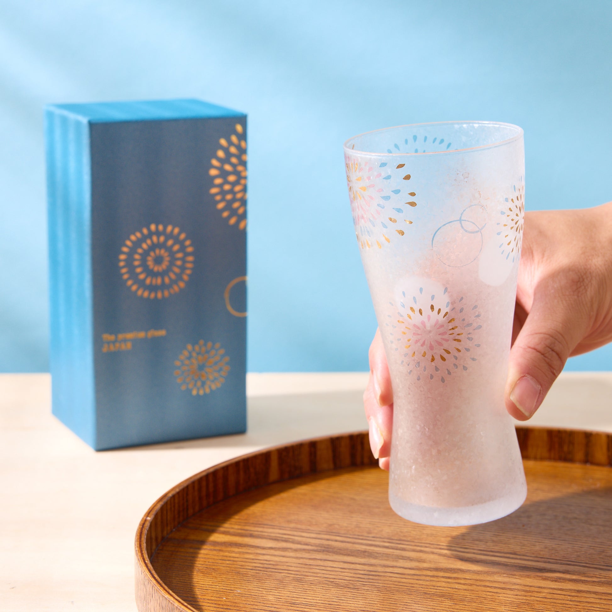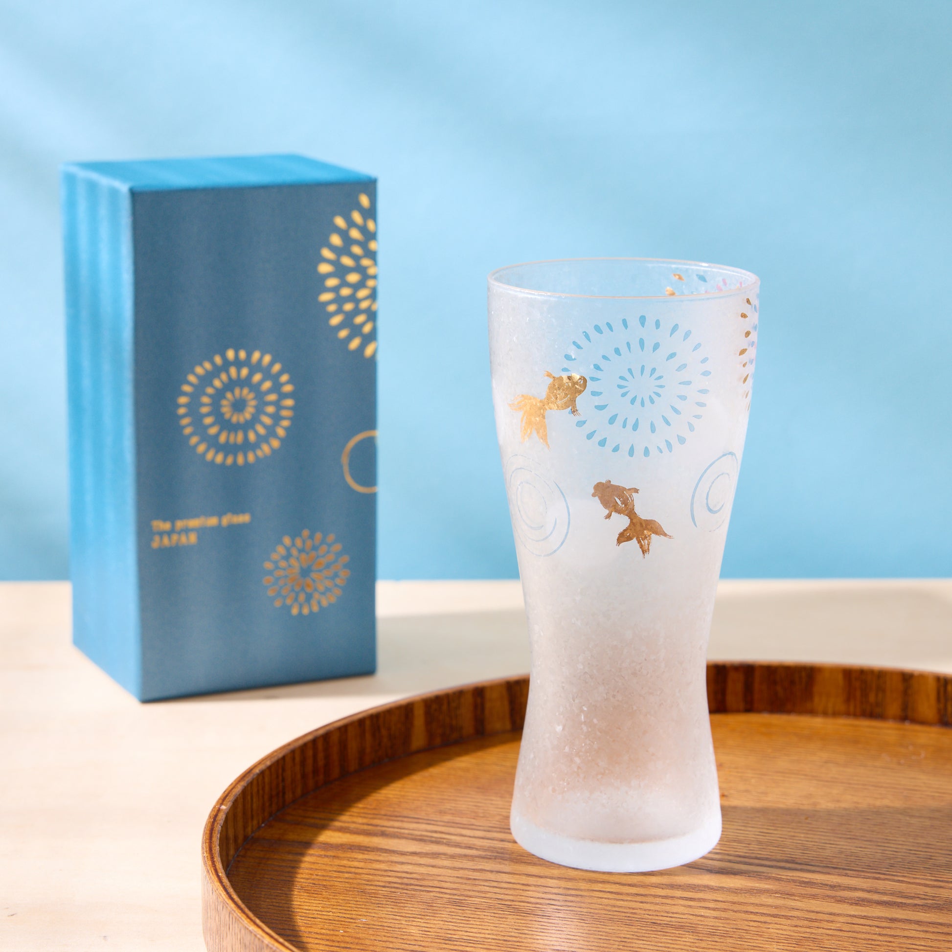 Fireworks are used as a good luck charm to ward off evil. The goldfish is considered a lucky charm for "golden fortune," and this motif is expressed in the glass. Bubble-making function: The sandblasted portion on the inner surface of the glass creates soft and creamy bubbles.