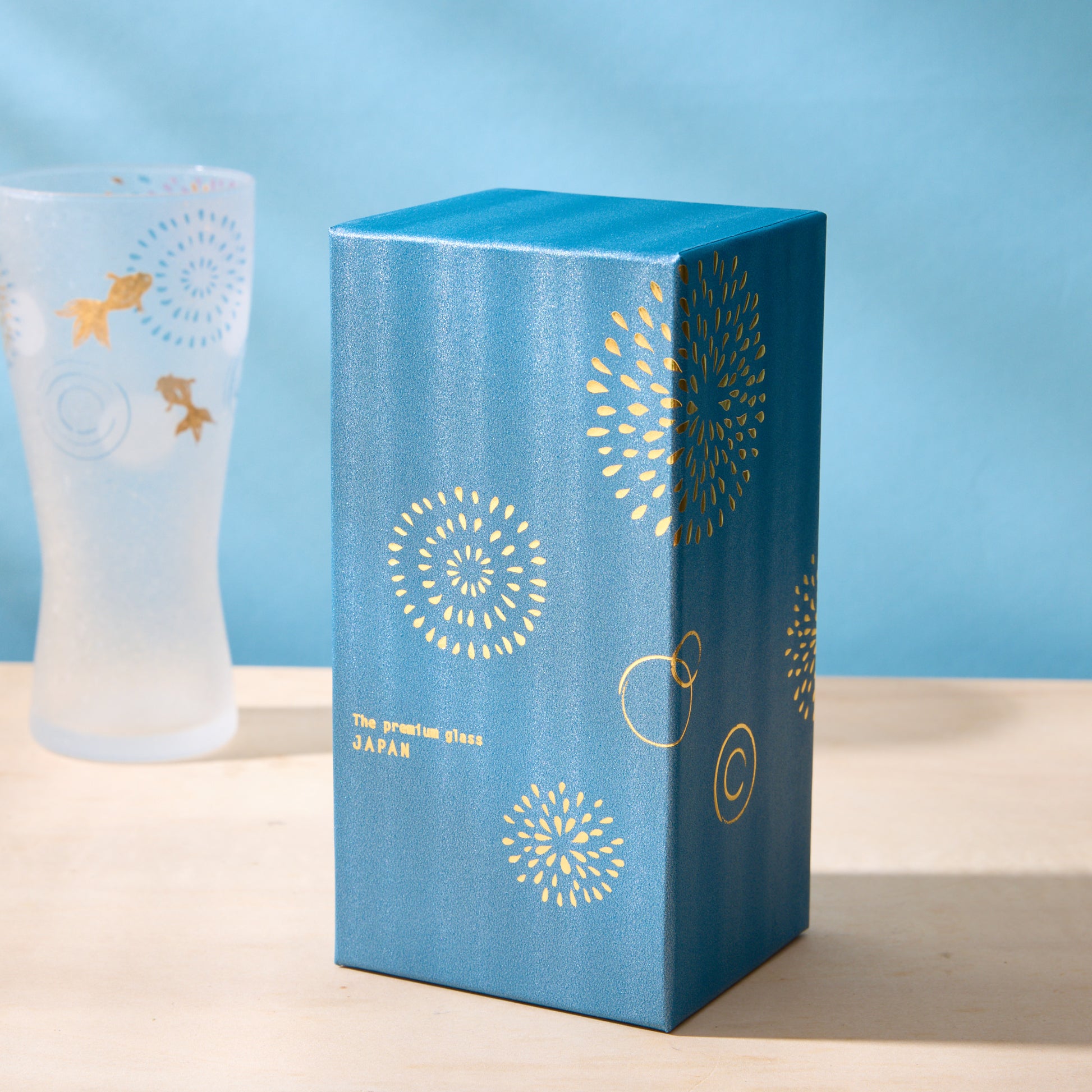 The box is made of pasted paper and stamped with gold leaf of fireworks to "make the person who gets the glass happy".