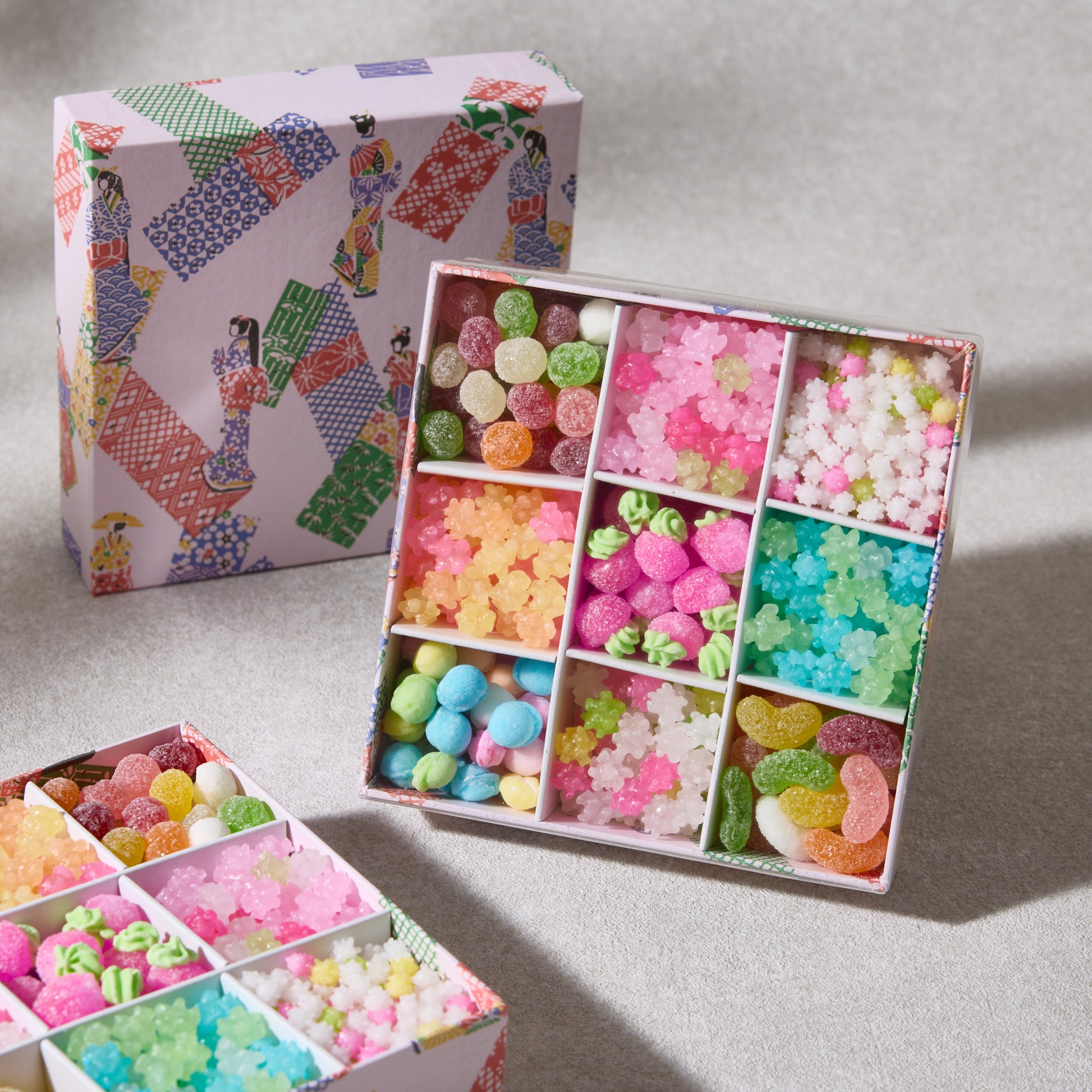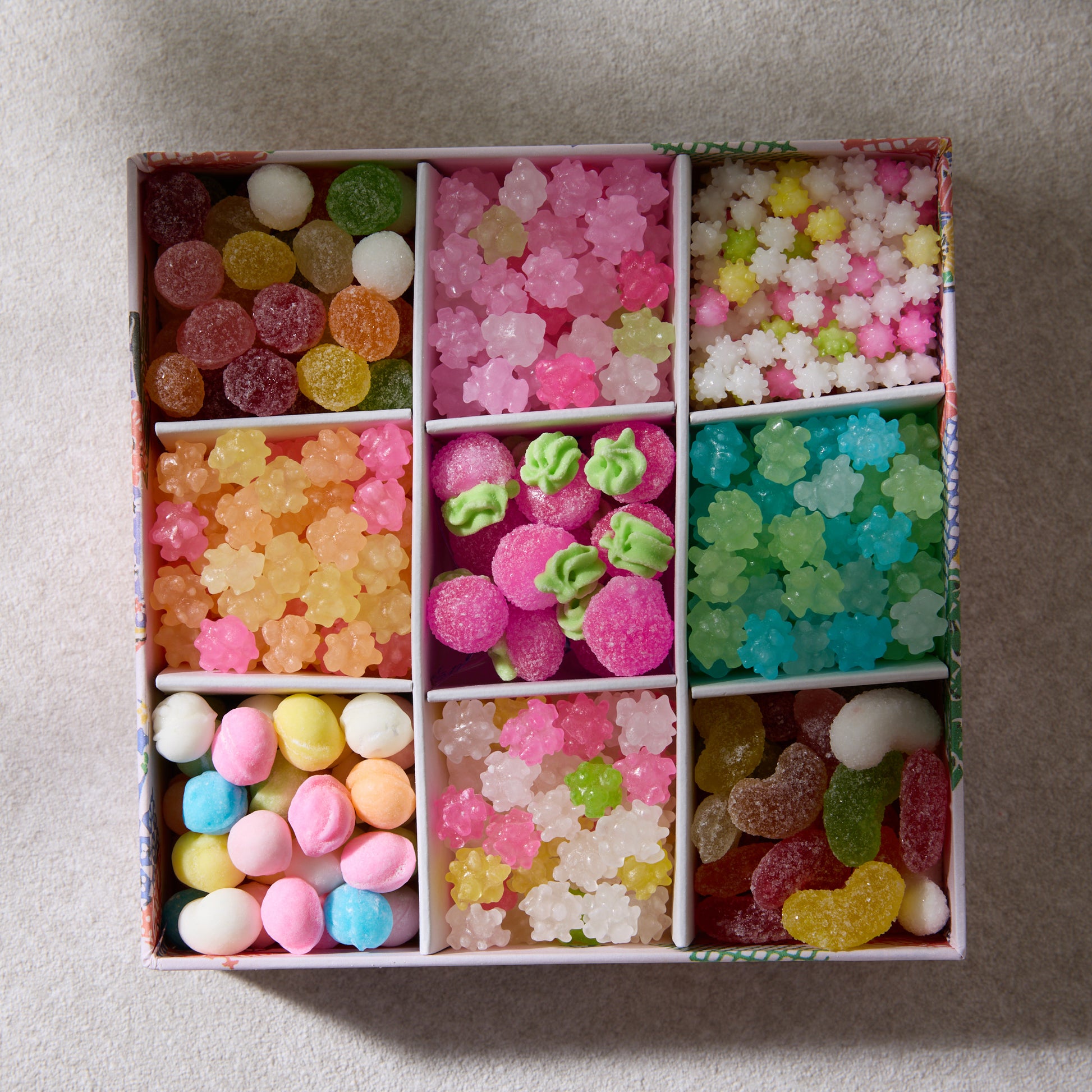 Inside the delicately patterned box, you’ll find: Japanese konpeito, classic star-shaped sugar candies with a crisp texture; bean drop jelly candies; strawberry bon bons; classic candy drops, and more.