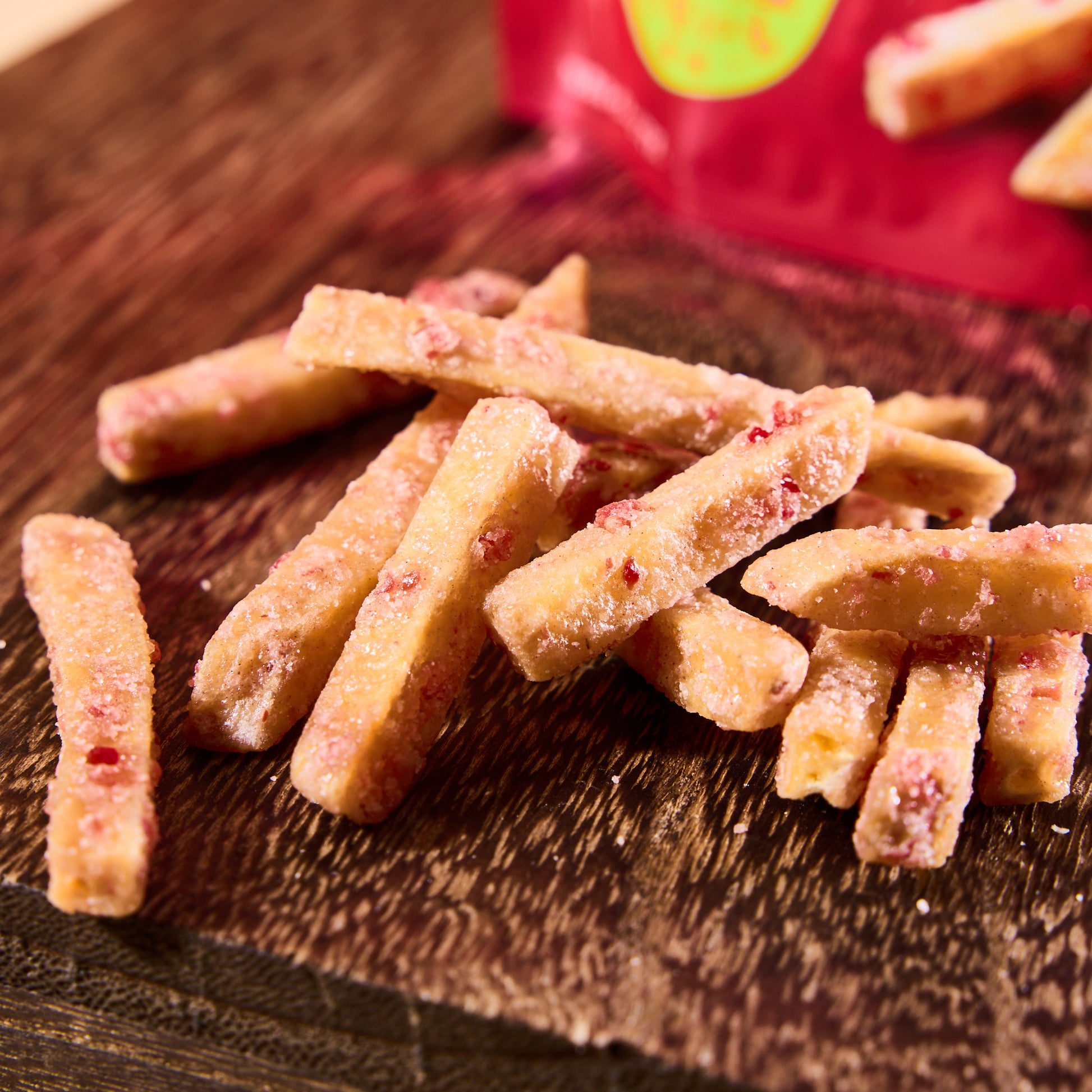 Discover a refreshing twist on a beloved Japanese snack with this berry-glazed take on traditional kenpi: thin slices of sweet potato are deep-fried until perfectly crisp, then coated in a fragrant glaze.