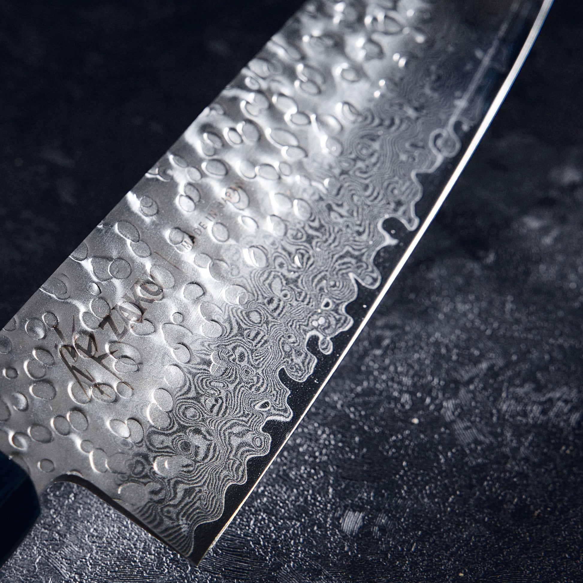 Hammered finish: The Tsuchime finish is a traditional Japanese technique that creates a dimpled texture across the blade’s surface, which helps reduce food adhesion by creating tiny air pockets that prevent ingredients from sticking. The result is smoother, more precise cuts with less interruption, allowing for a more seamless cooking experience.