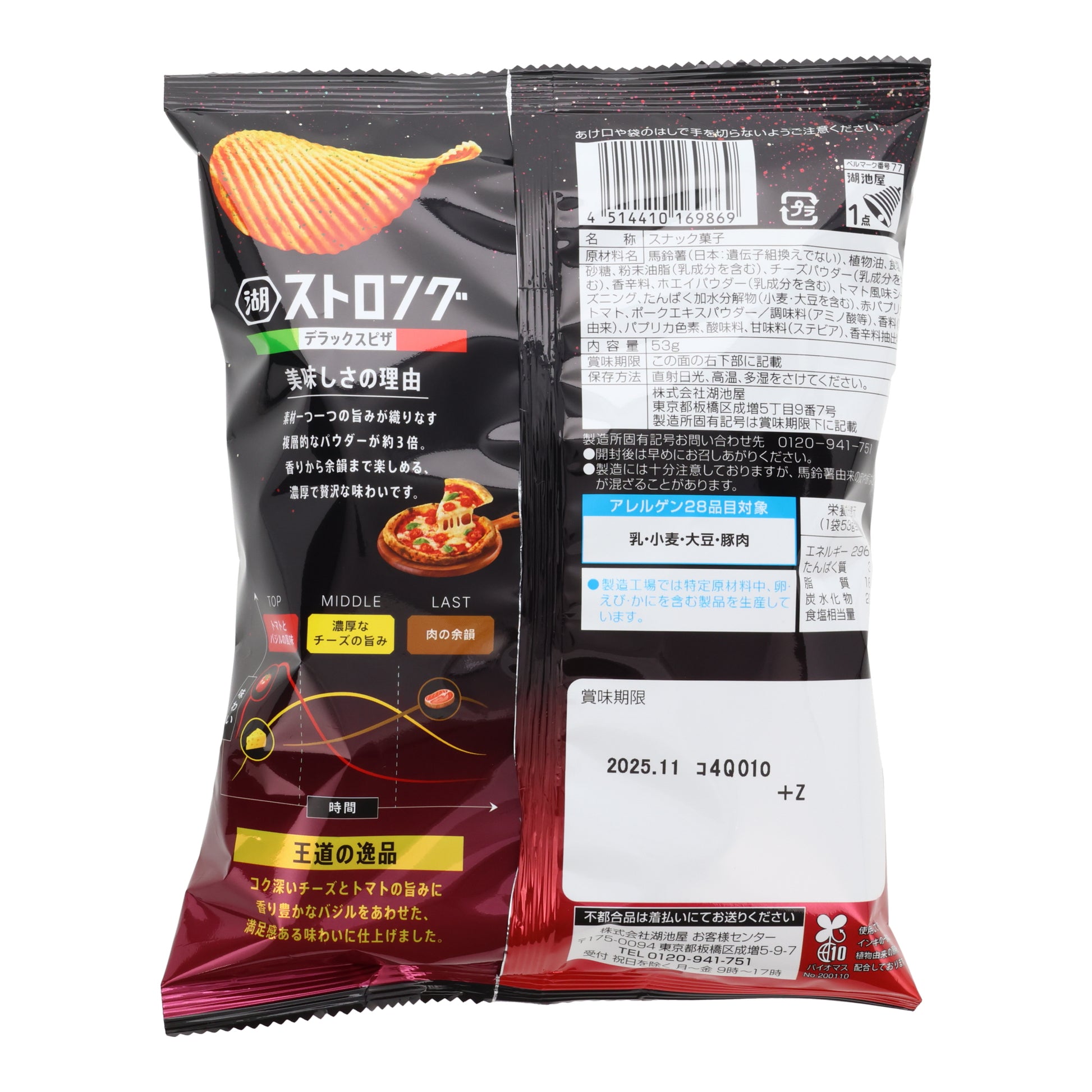 Turn up the crunch with the Koikeya Strong Deluxe Pizza Chips—Japanese chips that don’t hold back. The Koikeya Strong series features crunchy, thick-cut Japanese potato chips, generously seasoned for maximum flavor. This edition features a hearty blend of tangy tomatoes, creamy cheese, and fragrant basil, creating a savory pizza-inspired taste in each chip. Unleash the rich, crunchy flavors with every irresistible bite.