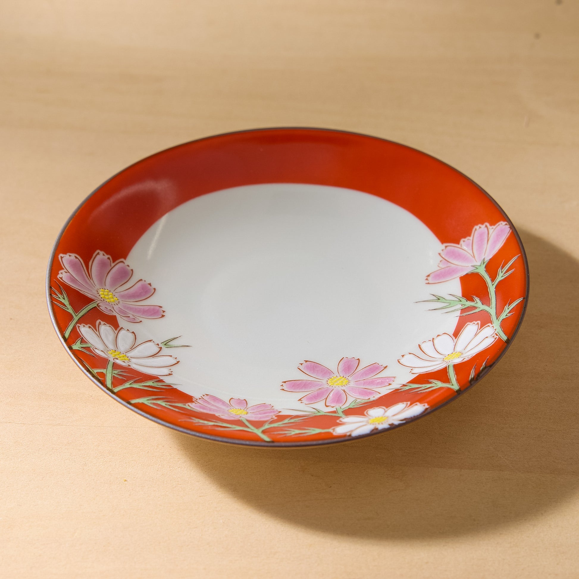 This expertly created Kutani Ware dish exemplifies traditional craftsmanship, showcasing the graceful beauty of cosmos flowers.