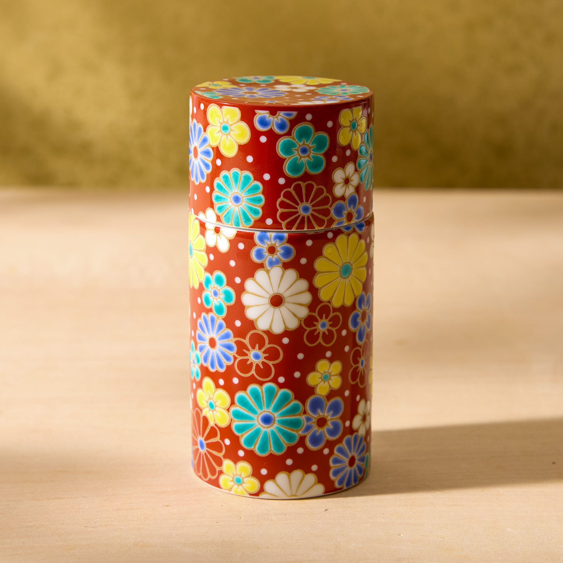 Both are beautifully decorated with a vibrant floral pattern set against a striking red background, showcasing the detailed craftsmanship of Kutani ware and skill of Japanese artisans.