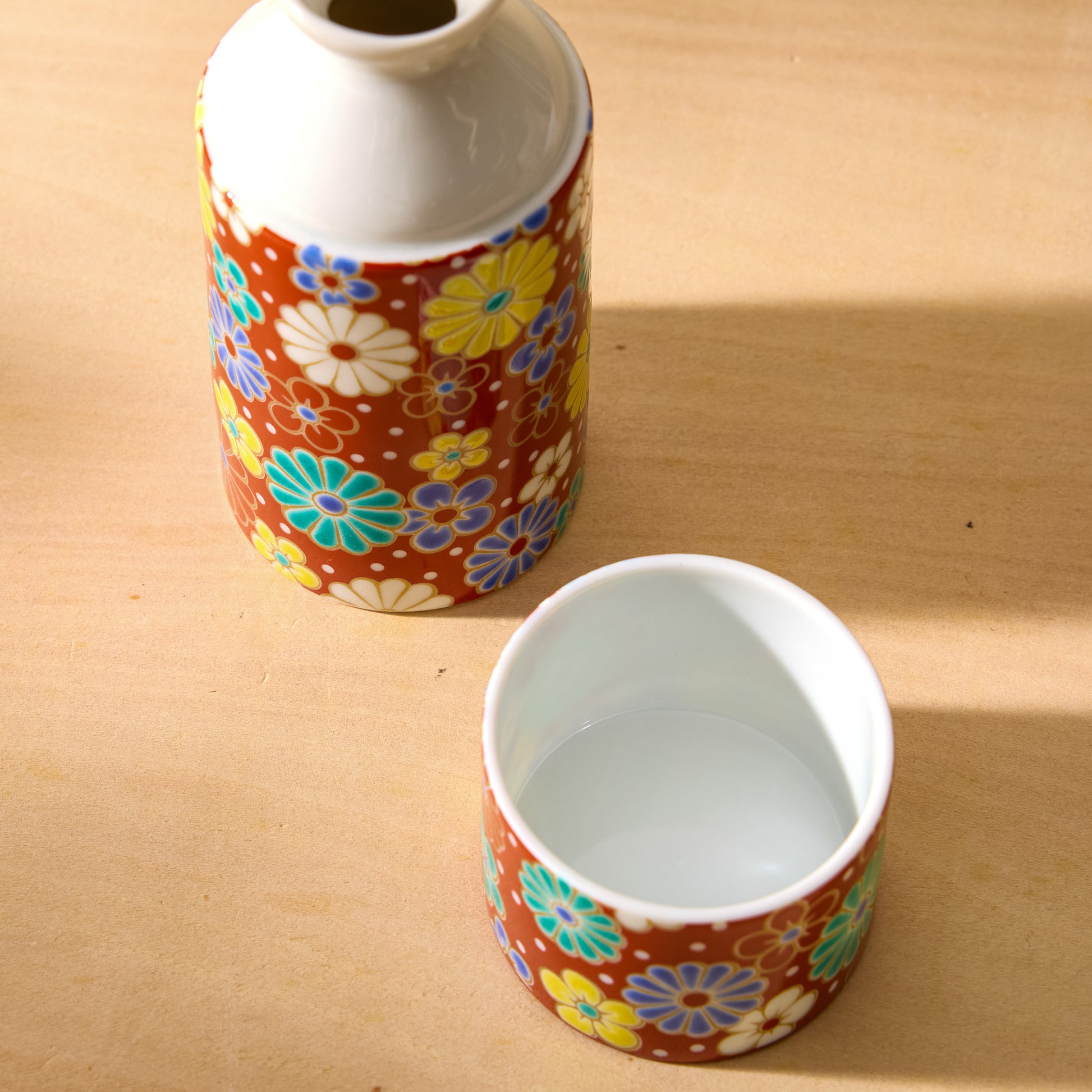 This Kutani Ware Sake Set, crafted by Seikou, a renowned kiln from Ishikawa, combines traditional artistry with functional design. The set includes a sake flask and matching cup that, when stored, seamlessly transform into a sophisticated cylindrical shape.