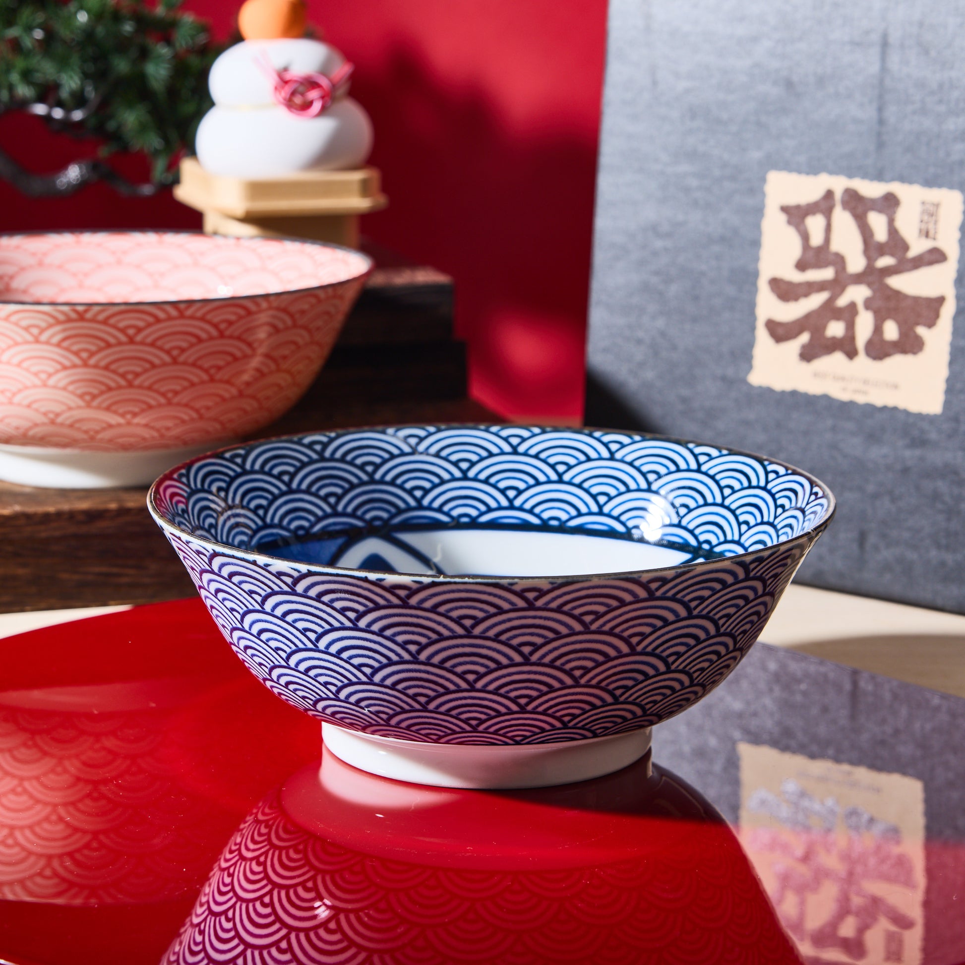 This delightful ramen bowl pair features the iconic maneki neko, Japan’s “beckoning cat”, believed to bring good luck, alongside traditional Seigaiha (blue ocean wave) patterns, crafted with care using Japan’s renowned Mino-yaki pottery techniques.