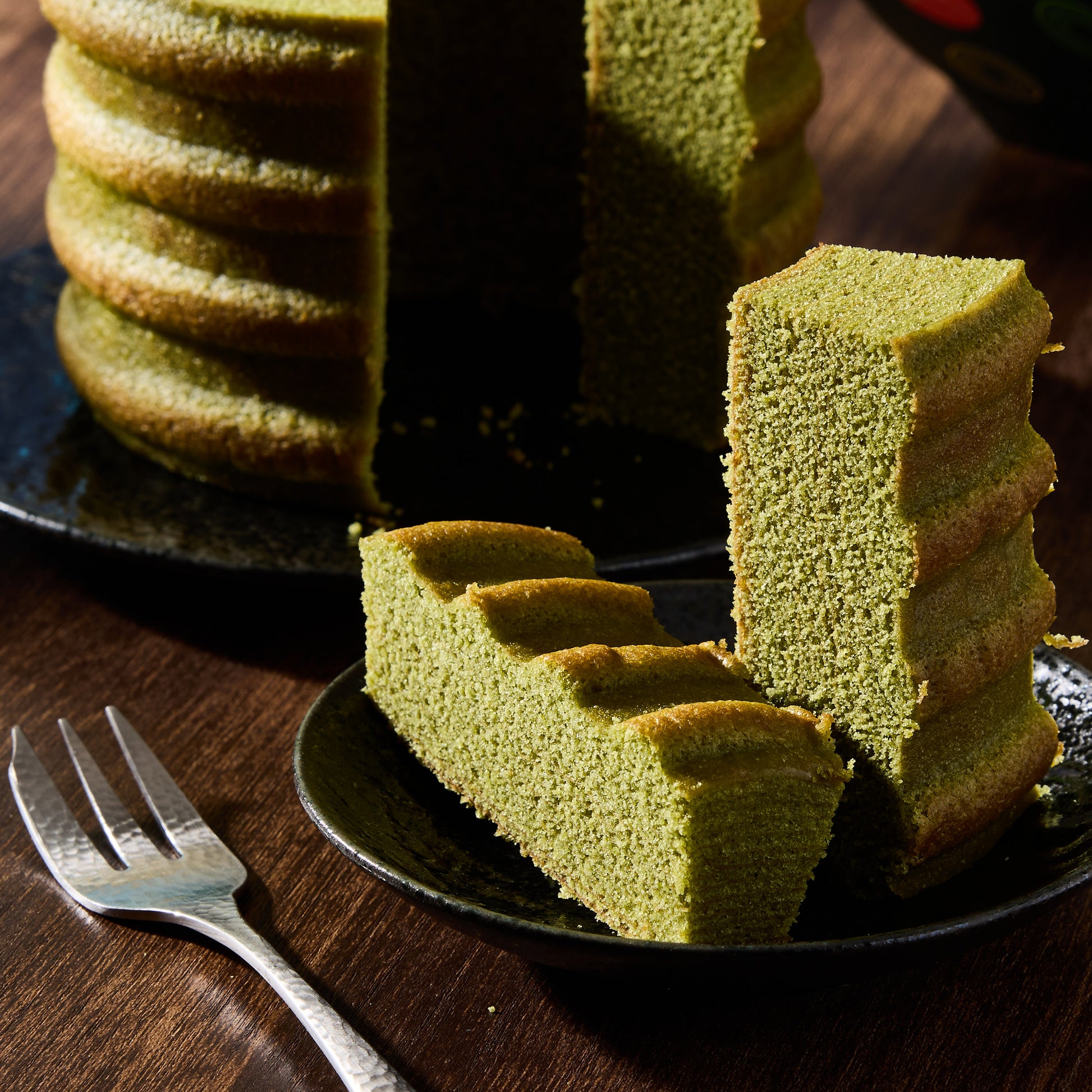 This rich, matcha-flavored baumkuchen features a delightfully moist texture and a subtly earthy, vibrant flavor that makes each bite a truly indulgent experience.