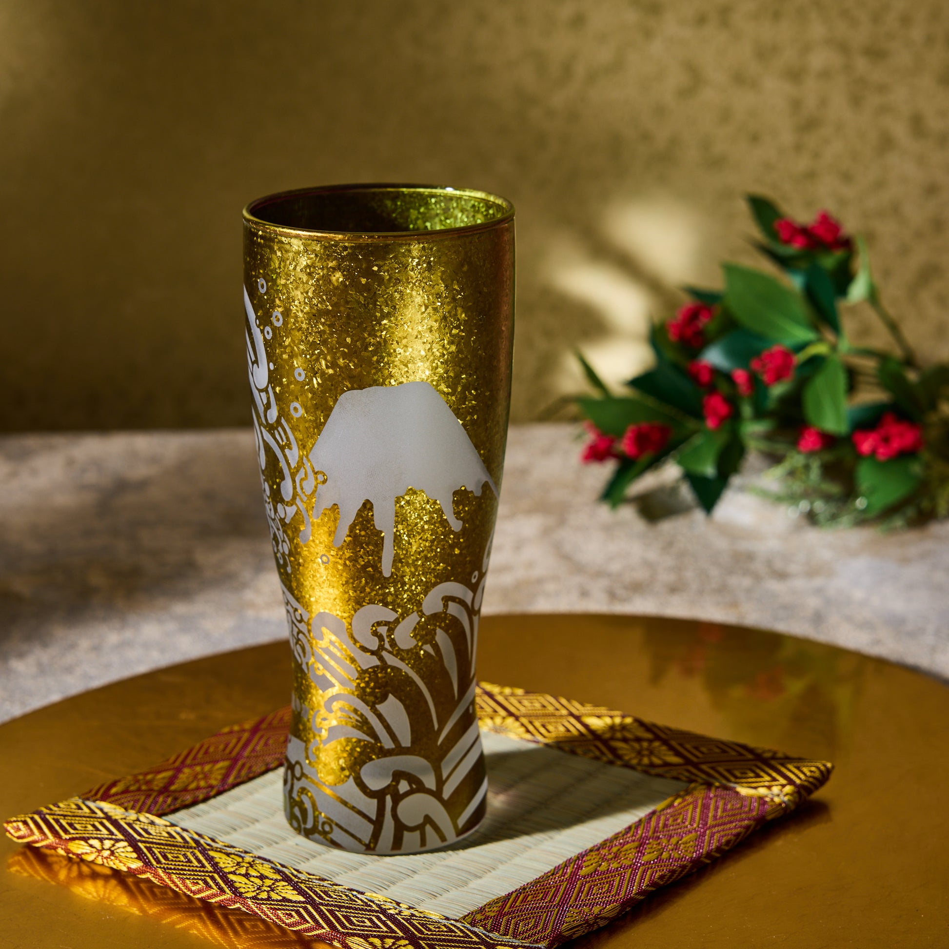 Experience the dazzling brilliance of this Japanese glass, a masterpiece of Mino Kiriko, the renowned cut-glass tradition from Gifu Prefecture. Crafted with meticulous care, the outer surface features a frosted crystalline finish, enhanced with hand-painted gold, silver, and bronze pigments before being fired to reveal a jewel-like glow that changes beautifully when light passes through.