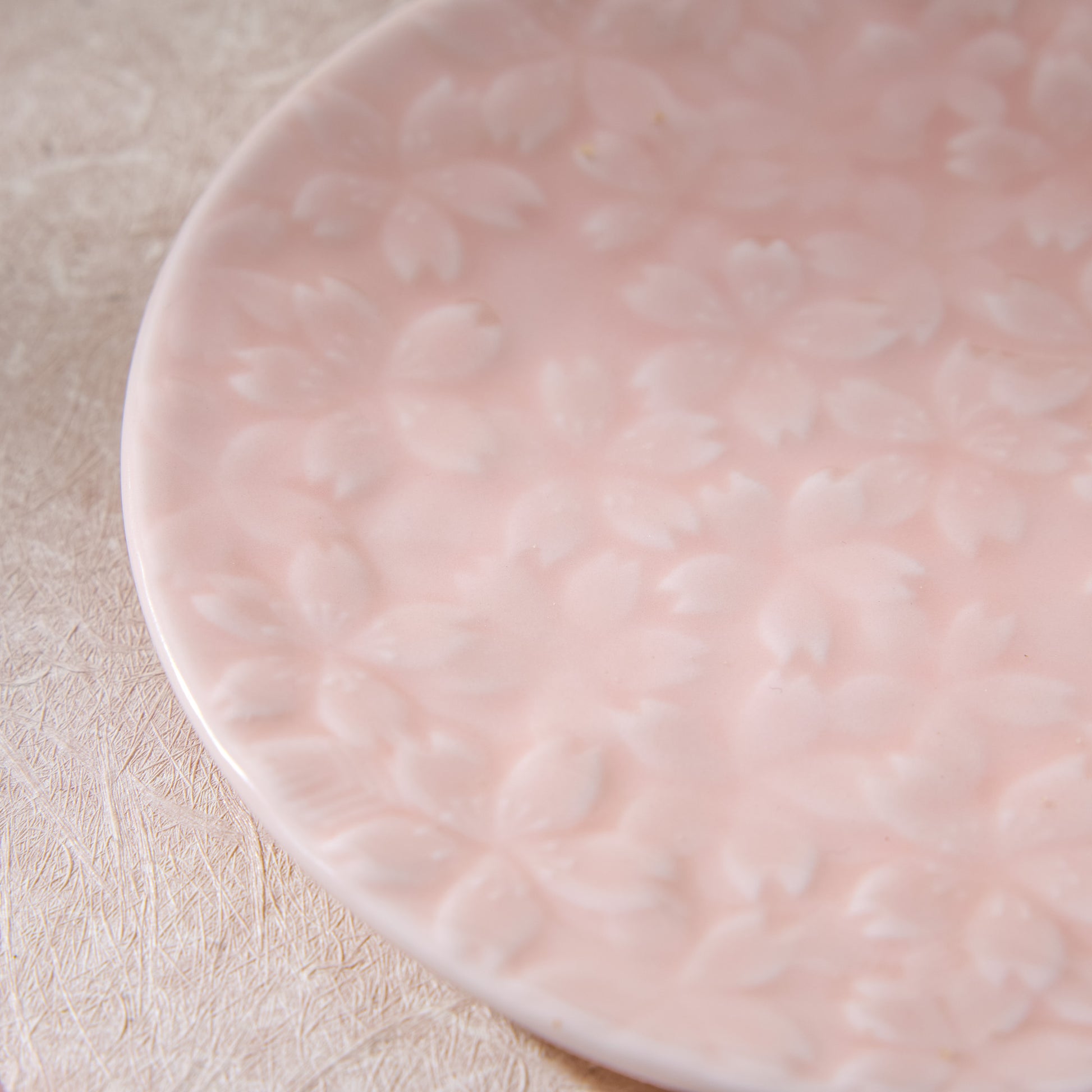The intricate design captures the ephemeral beauty of Japan's cherry blossoms with petals adorning the plate's surface. Subtly raised outlines add textured depth, while the plate’s size makes it ideal for serving appetizers. Crafted by artisans at Miyama (founded in 1977), it showcases the craftsmanship of mino ware—Japan's oldest and most celebrated ceramic style from Gifu Prefecture.