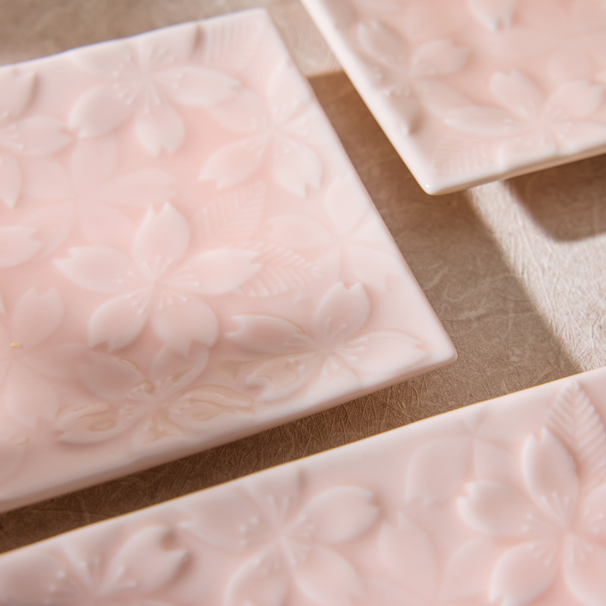 Crafted by artisans at Miyama, based in Gifu—the birthplace of mino ware—these pieces showcase the craftsmanship of Japan’s oldest and most celebrated ceramic style. Each plate glazed in soft pink hue featuring delicate embossed cherry blossoms, creating a textured depth.