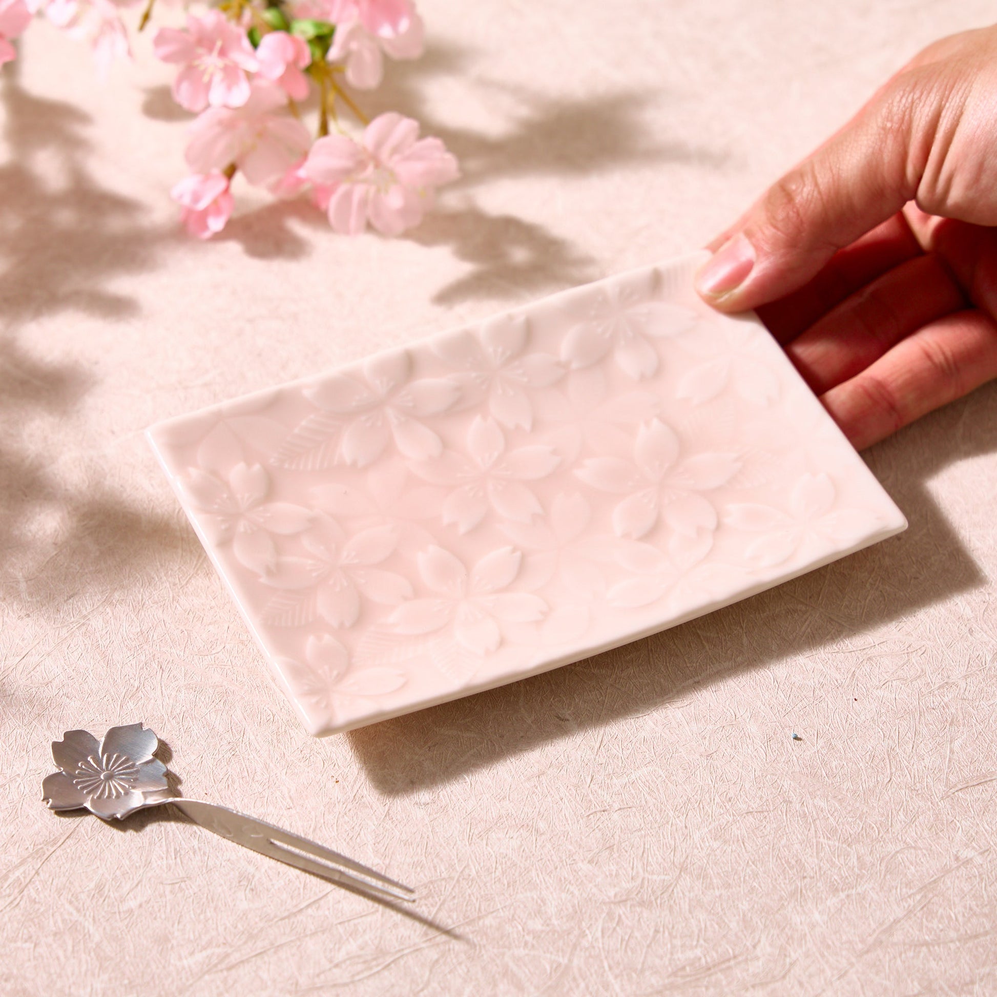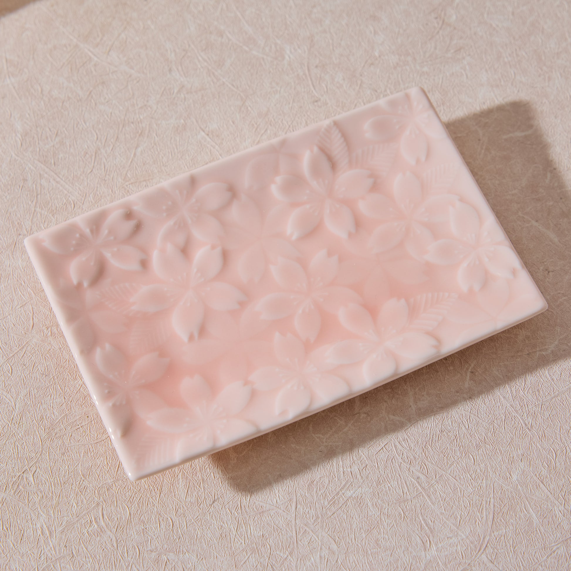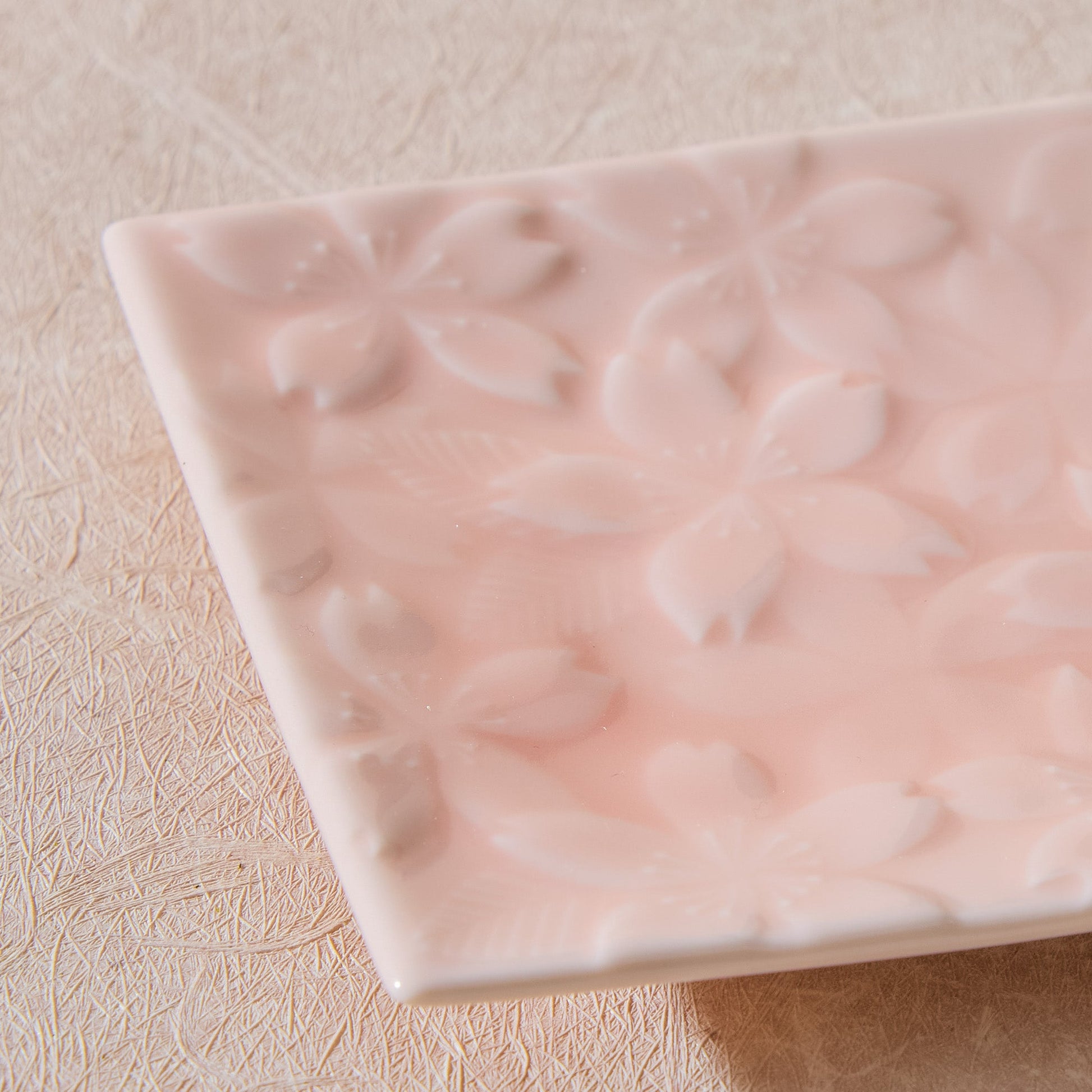 This small beautiful mino ware plate is glazed in soft pink hue featuring delicate embossed cherry blossoms, creating a textured depth.