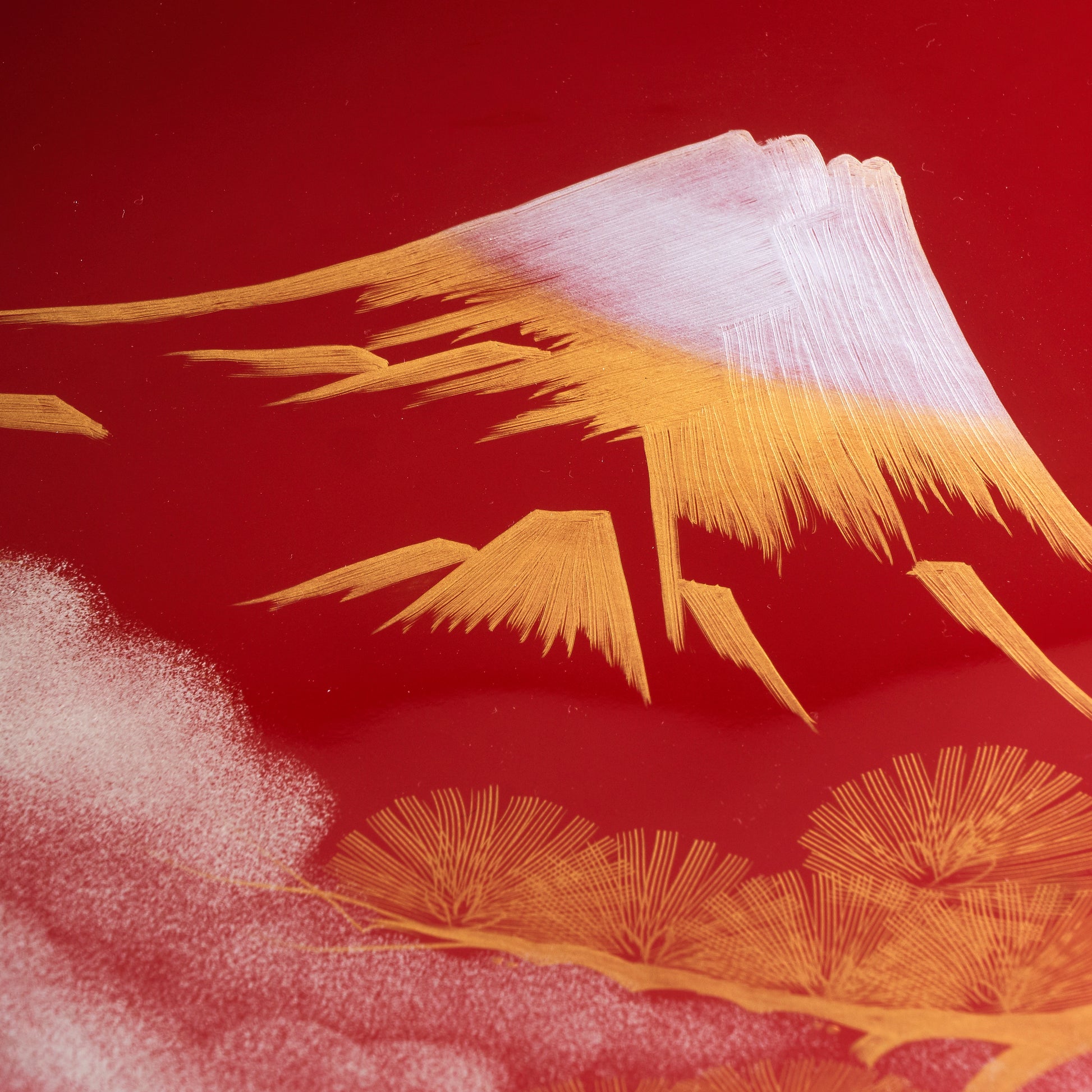 This exquisite plate, with its golden artwork highlighted by ruby red lacquer, beautifully depicts the majestic mountain, accompanied by pine trees representing prosperity and a captivating haze in the background.