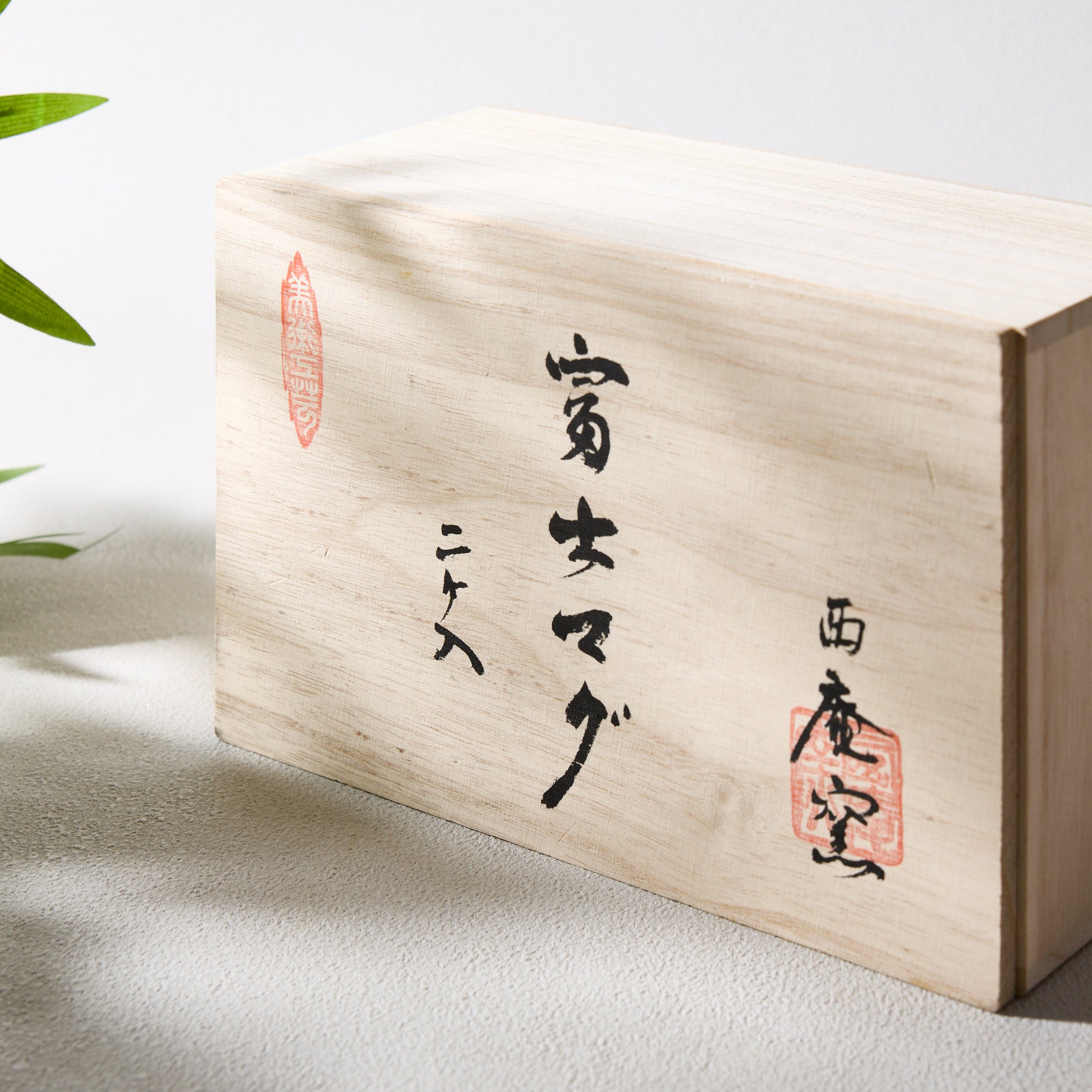 The two colors, red and blue, represent Mt. Fuji at sunrise and in moonlight, two revered views in Japanese tradition. The base is shaped like a cherry blossom, visible when the mug is turned upside down and they come packaged in a traditional kiribako (paulownia wood box).