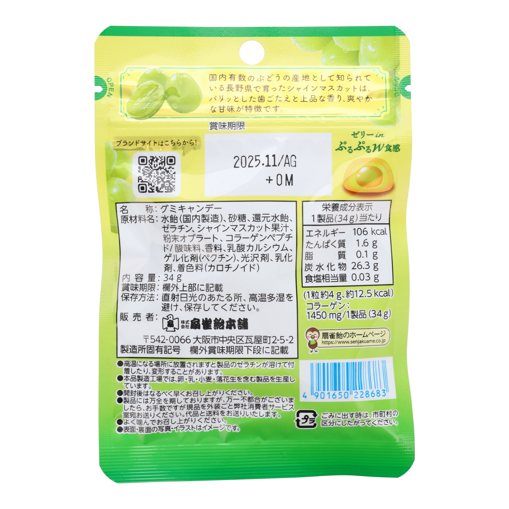 Indulge in the luxurious taste of the carefully selected Nagano Shine Muscat grapes with each bite of this premium gummy. The sweet and refreshing flavor is complemented by a rich jelly filling, offering a unique texture that enhances the treat. Savor the flavor of this yummy Japanese candy with every juicy, chewy bite.