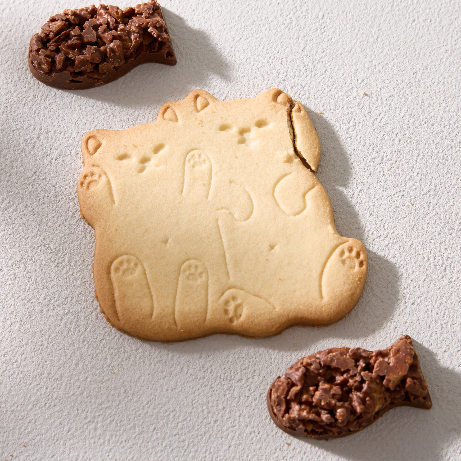 This set includes three sable cookies shaped like cats lying on their backs in an adorable tummy-up pose, offering a rich, buttery flavor. Also included are five chocolate crunch bars shaped like fish, adding a playful, sweet touch.