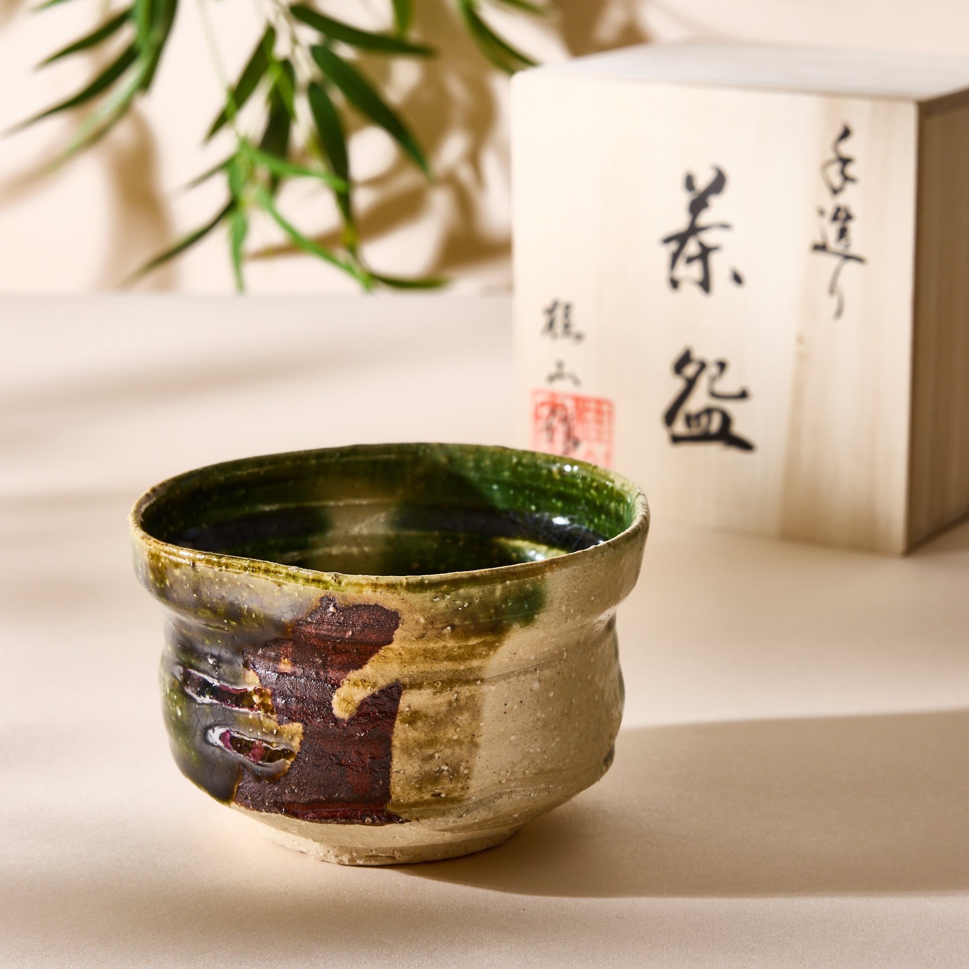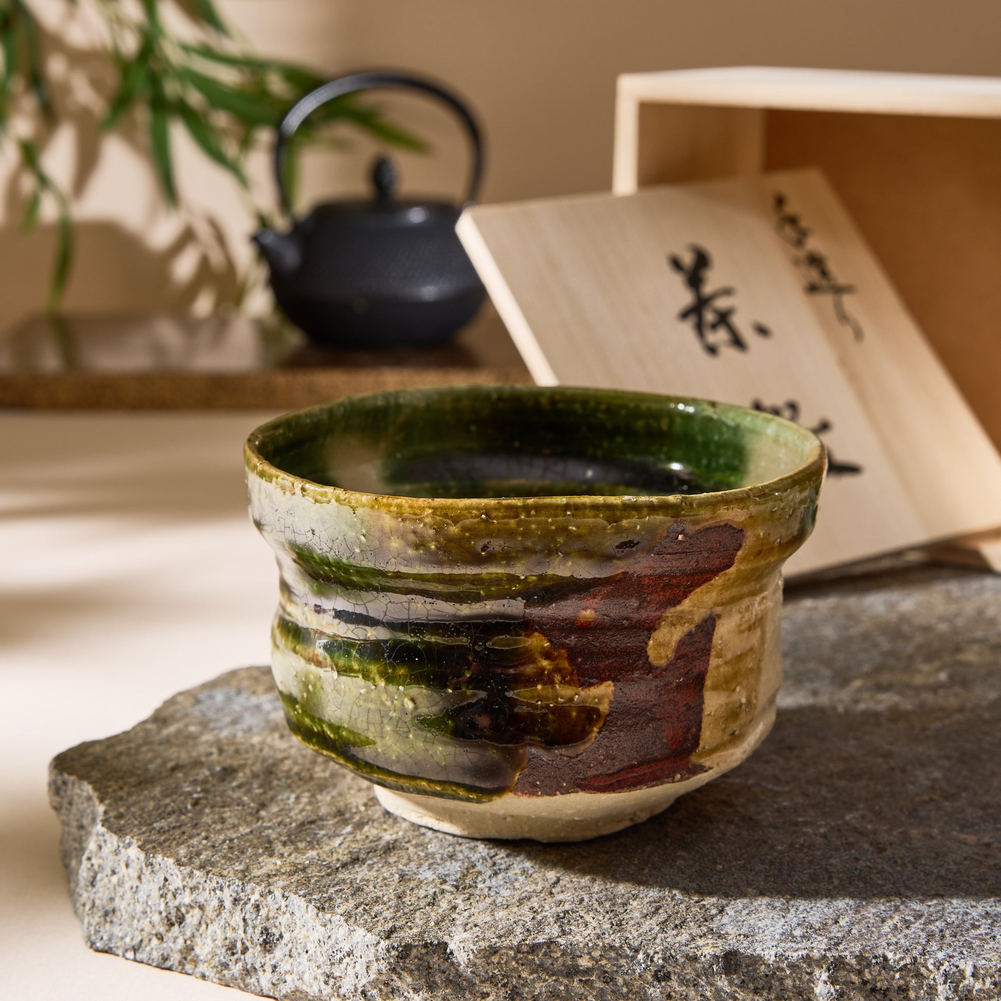 The bowl features a striking Oribe glaze, known for its rich earthy hues and bold, innovative design, which dates back to the Momoyama period (1573-1600). This style, originally influenced by the legendary tea master Furuta Oribe, blends traditional artistry with modern creativity.