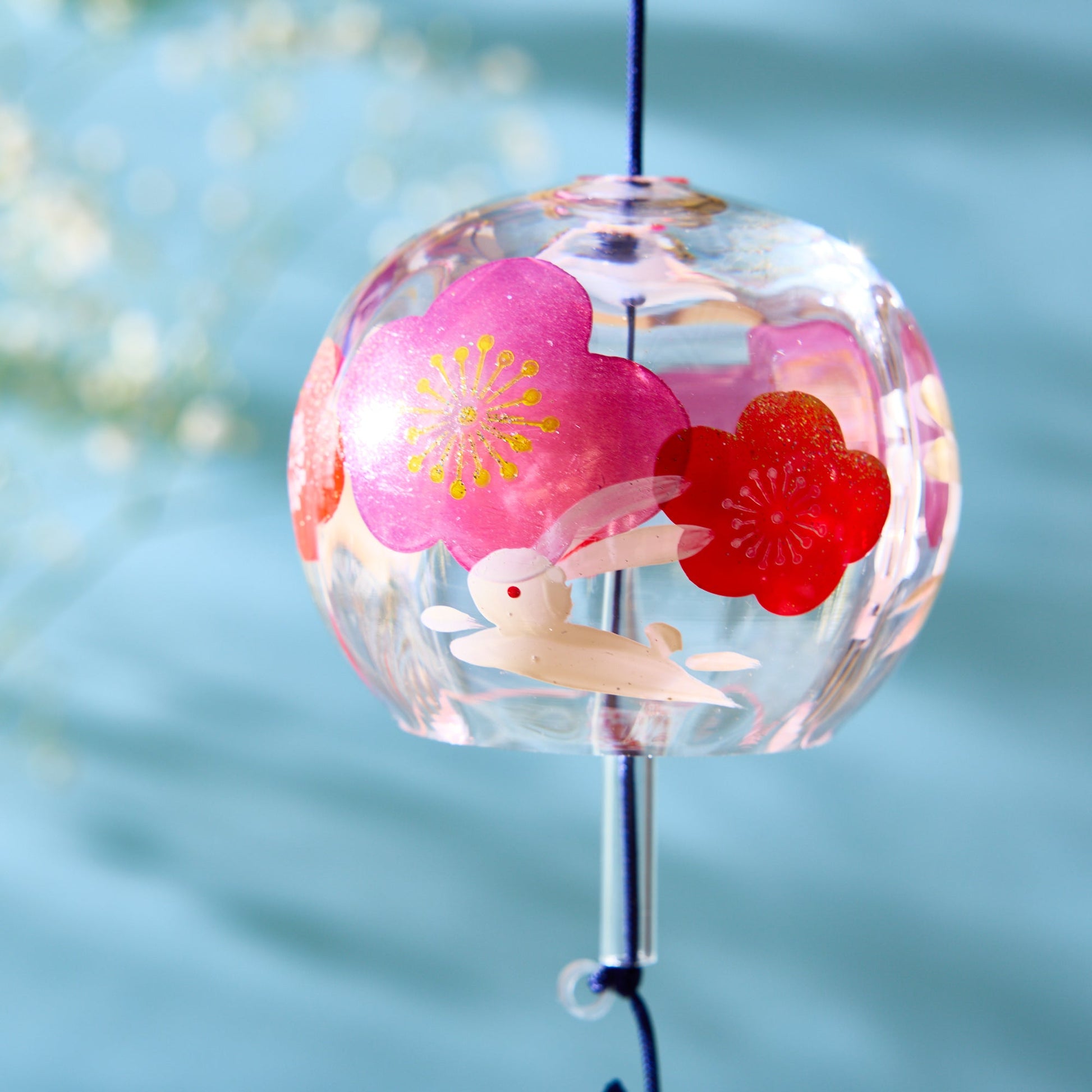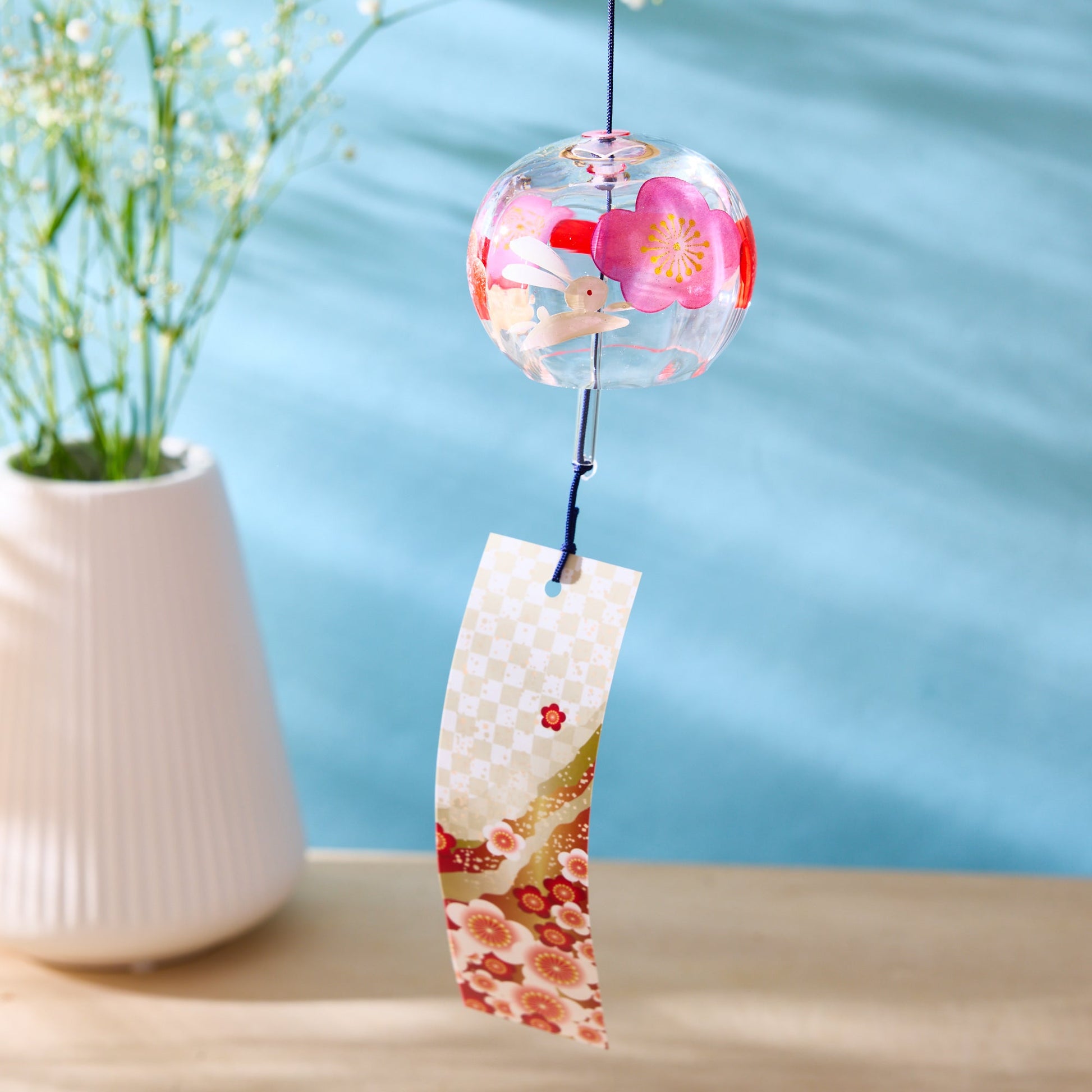 Handcrafted from cloisonné glass, this furin wind chime captures the quiet charm of the season with a delicate design featuring plum blossoms and a white rabbit, symbols of renewal and serenity in Japanese culture.