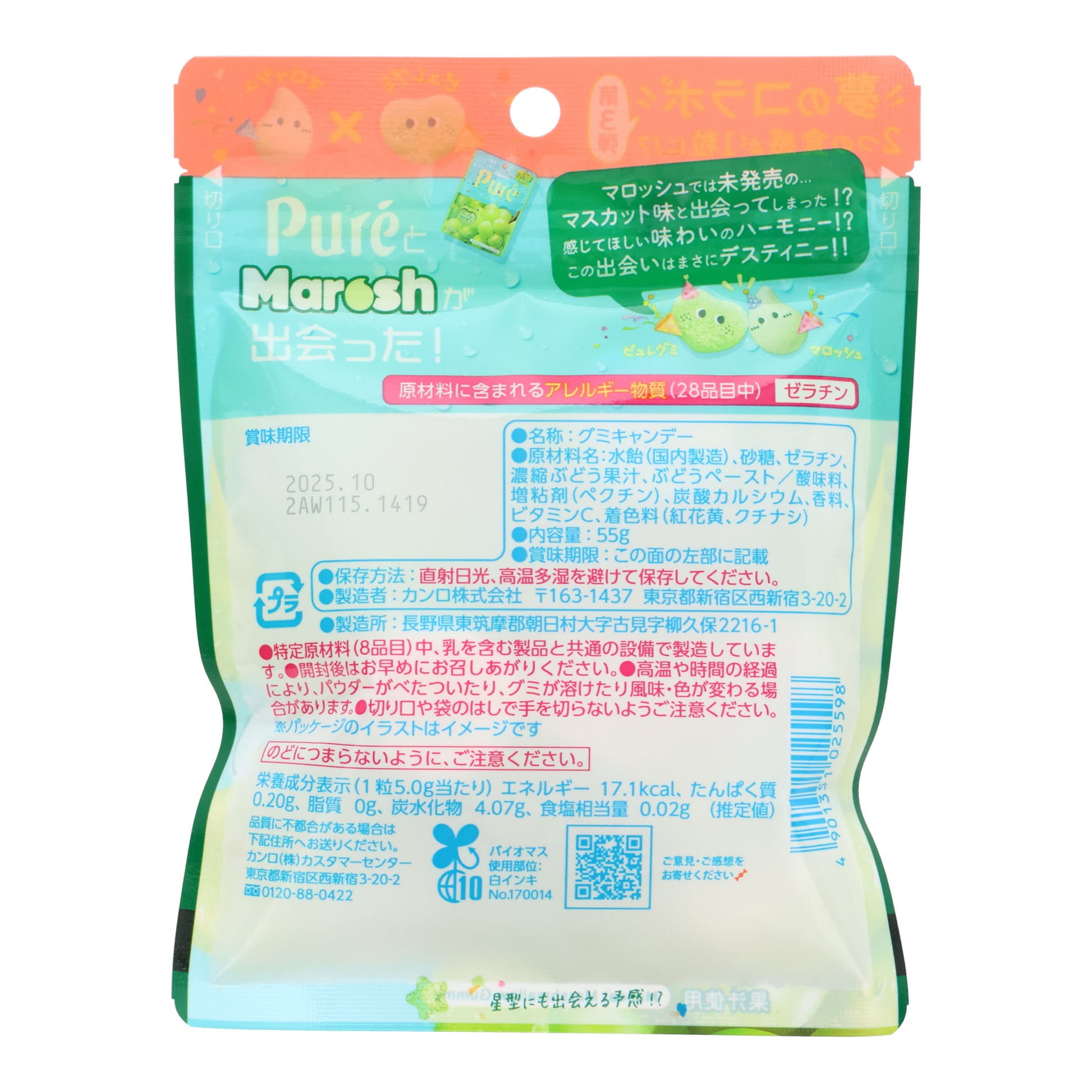 Enjoy a delightful blend of two textures in one gummy with the Pure Gummy x Marosh Muscat Grape. This unique Japanese candy combines the chewy, fruit-filled texture of Pure Gummy with the smooth, melt-in-your-mouth sensation of Marosh, creating an enjoyable harmony of taste and texture.