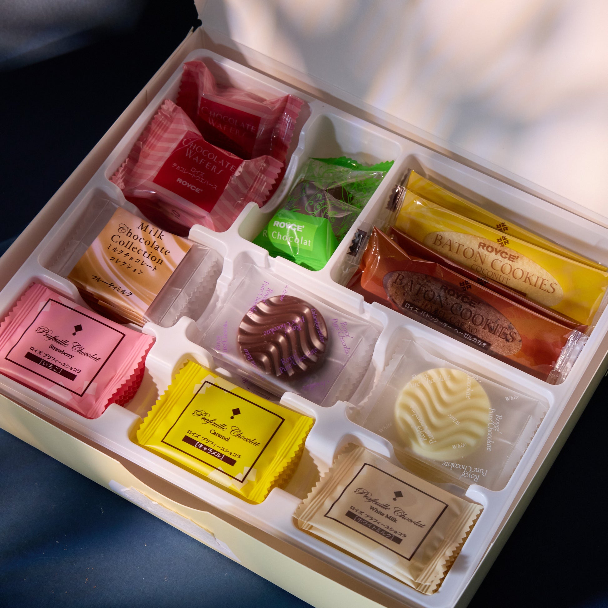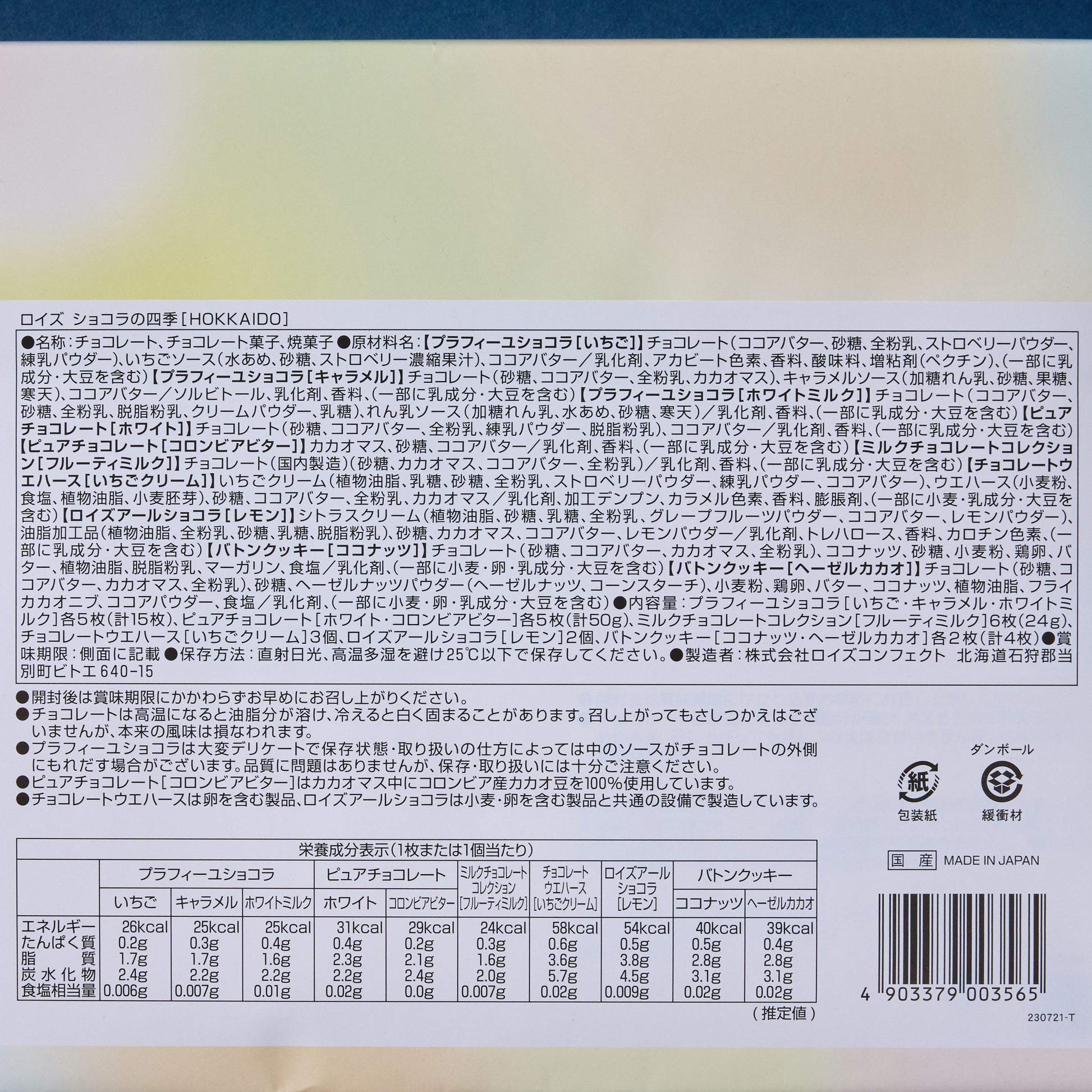 -White Chocolate (5 pieces) – a rich Hokkaido milk flavor. -Fruit Milk Chocolate (6 pieces) – made with cacao beans with a slightly fruity and acidic taste. Complements the sweet milk chocolate.