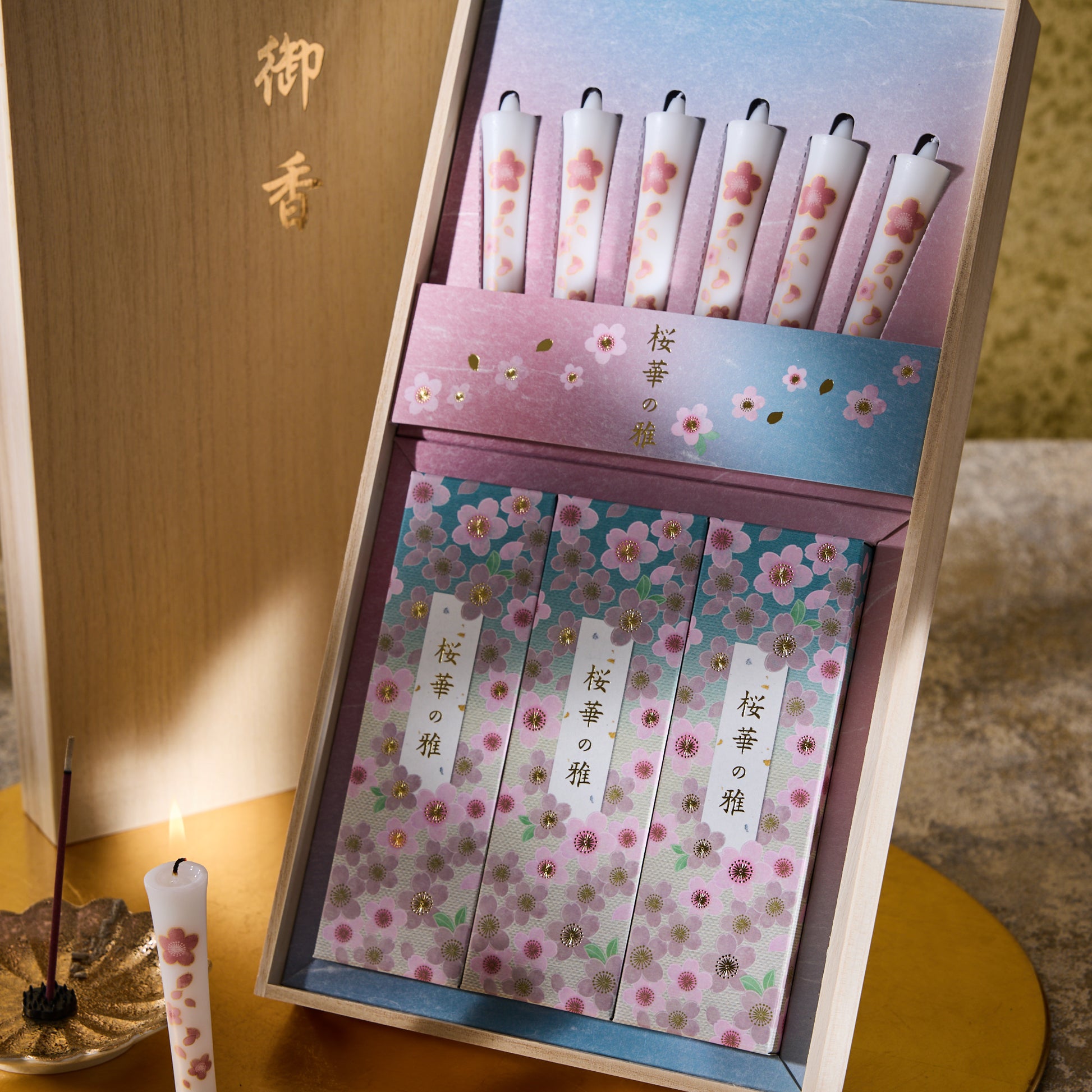 Bring the gentle beauty of cherry blossoms into your home with this elegant candle and incense gift set.