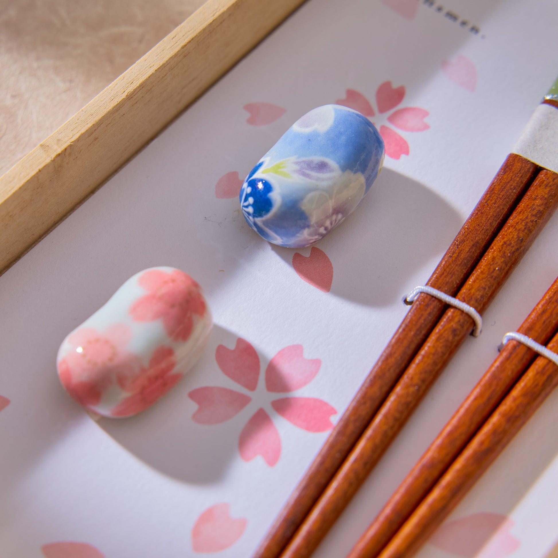 Bring the beauty of cherry blossoms to your table with this refined gift set. Featuring elegantly crafted chopsticks in soft green and pink, along with matching petal-shaped rests.