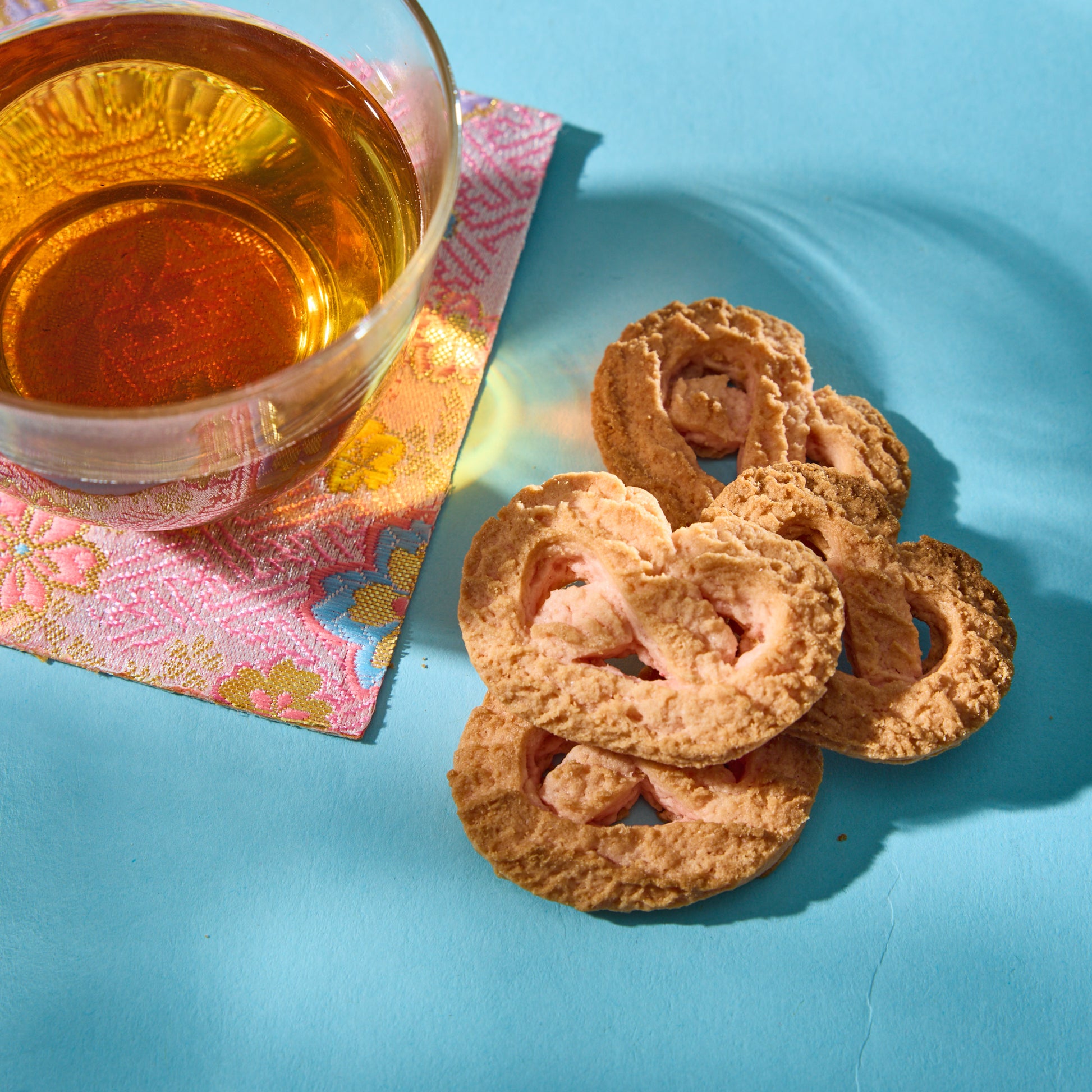 The hojicha tea is infused with cherry blossom leaves and refreshing grapefruit, filling your cup with a sweet aroma. Paired with this tea are crumbly strawberry cookies, where the sweet fragrance of cherry blossoms complements the tartness of strawberries, creating a perfect harmony of flavors.