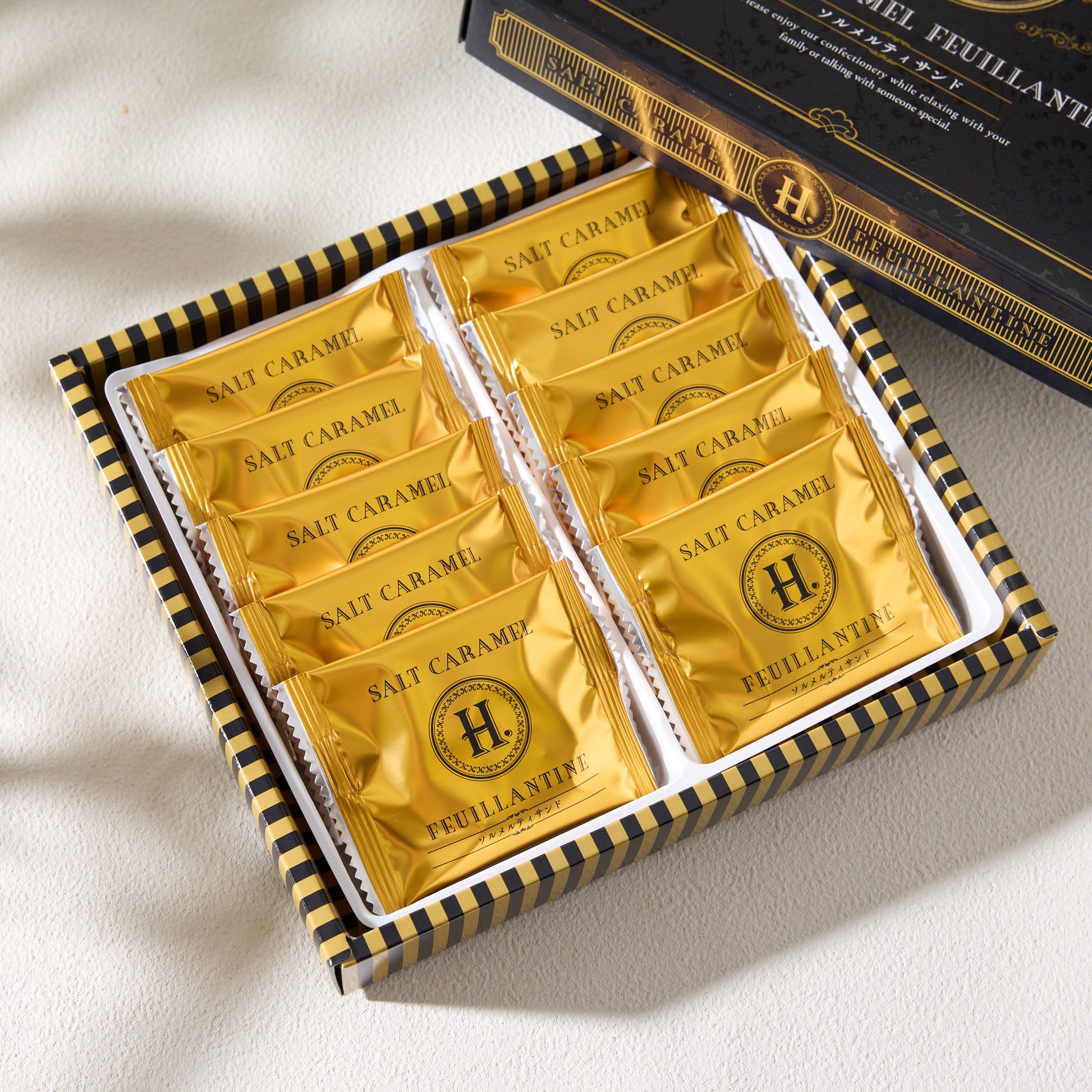 Each crisp, caramel-infused biscuit is coated with delicate feuilletine flakes for an irresistible crunch. At the center, smooth salted caramel cream enhances the deep caramelized notes, creating a luxurious melt-in-your-mouth experience.