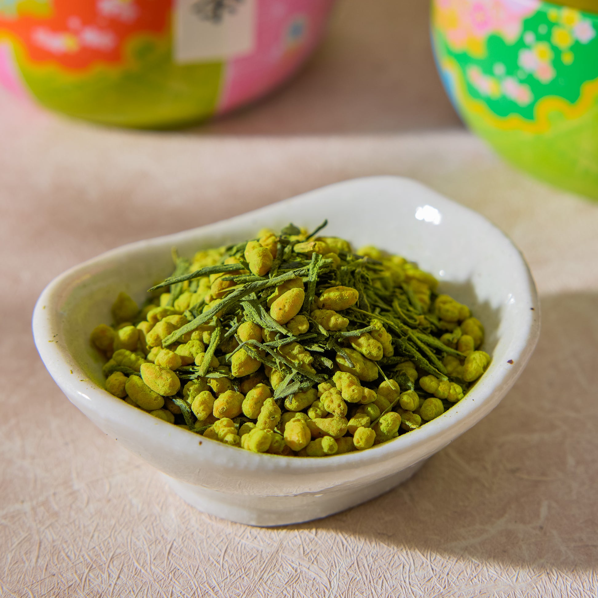The other canister holds Genmaicha with Matcha (抹茶入り玄米茶), a delightful blend of toasted rice and green tea infused with matcha powder. This pairing offers a balance between the nutty, savory notes of Genmaicha and the rich, umami depth of Matcha, creating a full-bodied, satisfying brew.