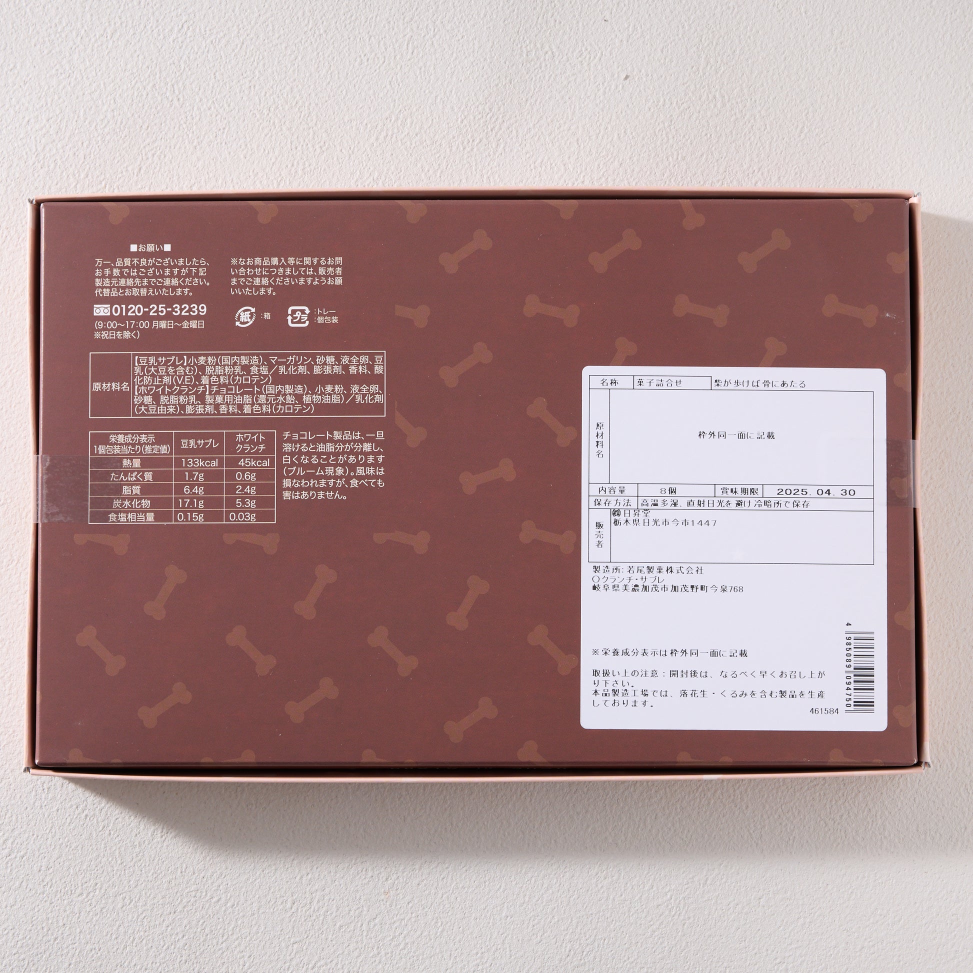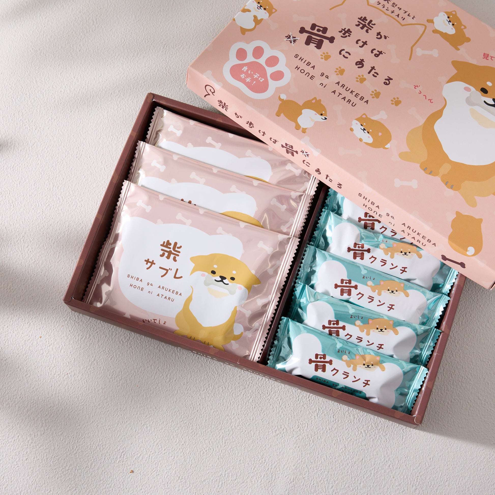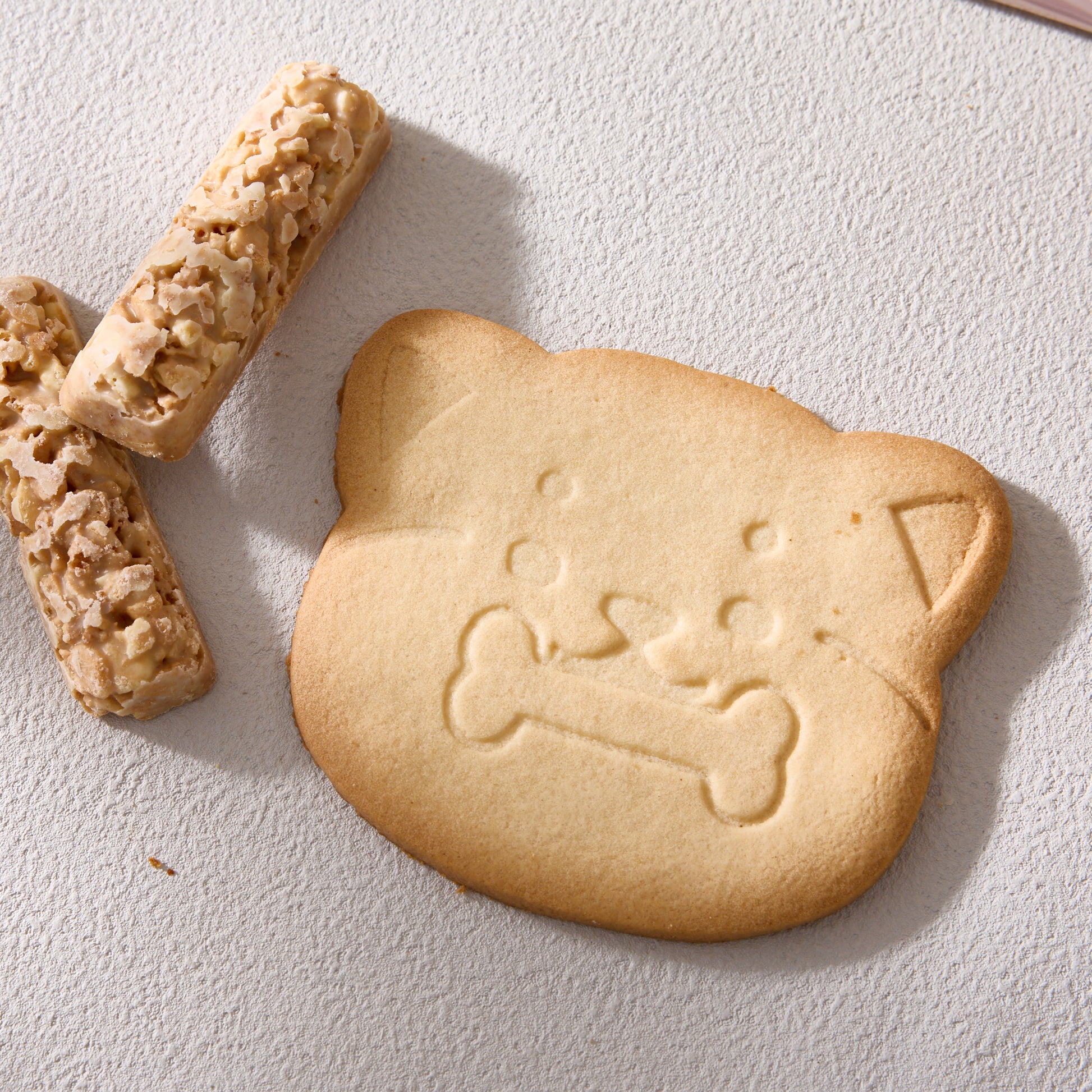 This set includes three sable cookies shaped like an adorable Shiba Inu holding a bone, offering a rich, buttery flavor. Also included are five white chocolate crunch bars, symbolizing dog bones, for a sweet and crunchy twist.