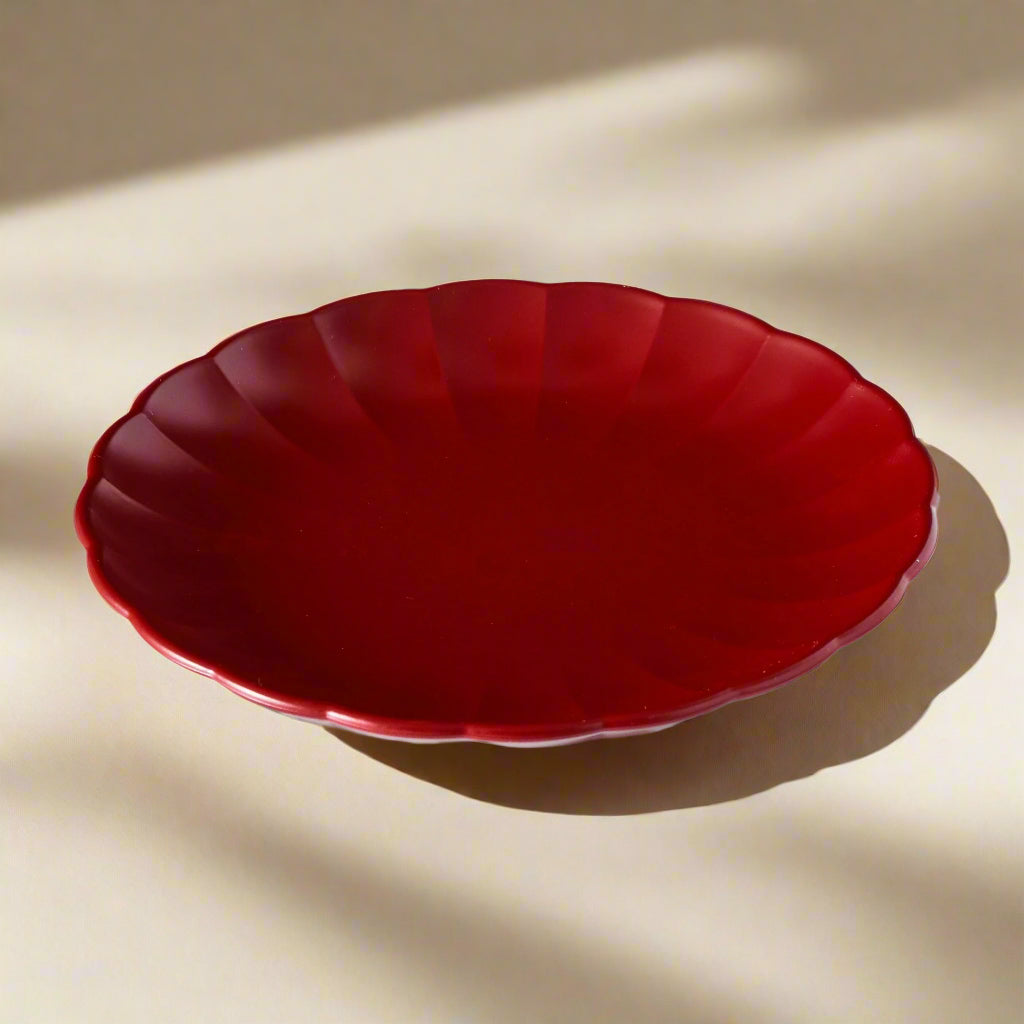 This flower-shaped lacquerware plate in a calming ancient vermilion hue is crafted with precision and showcases traditional Japanese lacquerware artistry. It is ideal for enjoying wagashi or other small treats with a refined touch.
